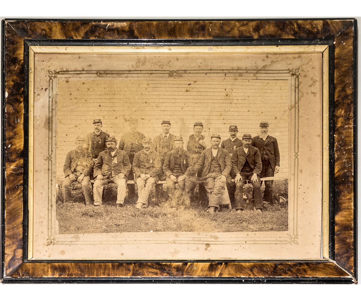 The soldiers are wearing ribbons, so this is likely a Grand Army of the Republic group. Twelve soldiers. 5.75" x 8" in 9.5" x 11.75" frame. Heavy soiling. Fair contrast.