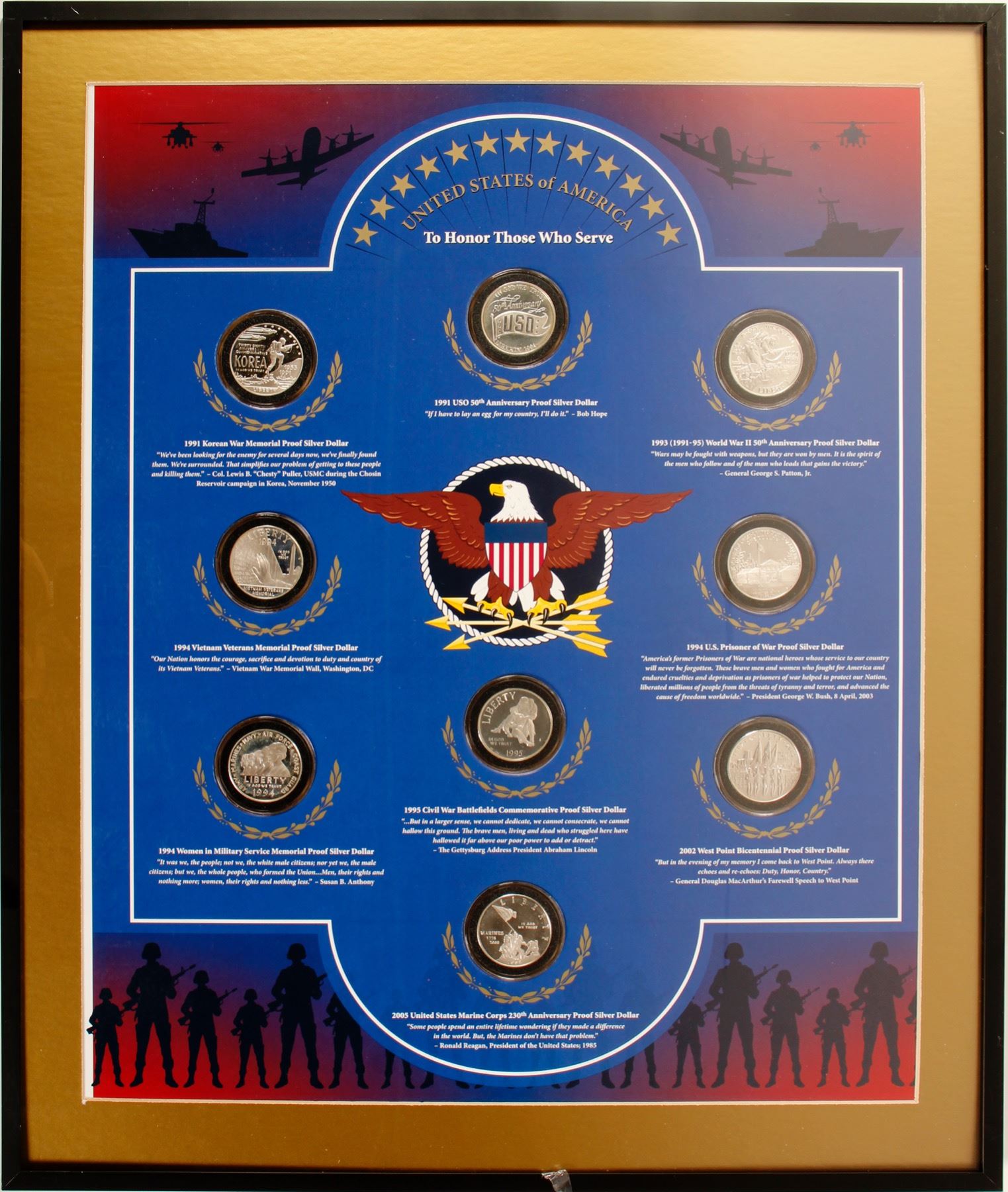This is an approximately 24x20-inch framed display of nine encapsulated Fine Silver proof coins commemorating different aspects of United States military service. Each of these coins was struck by the United States Mint as part of their Commemorative Coin Programs.