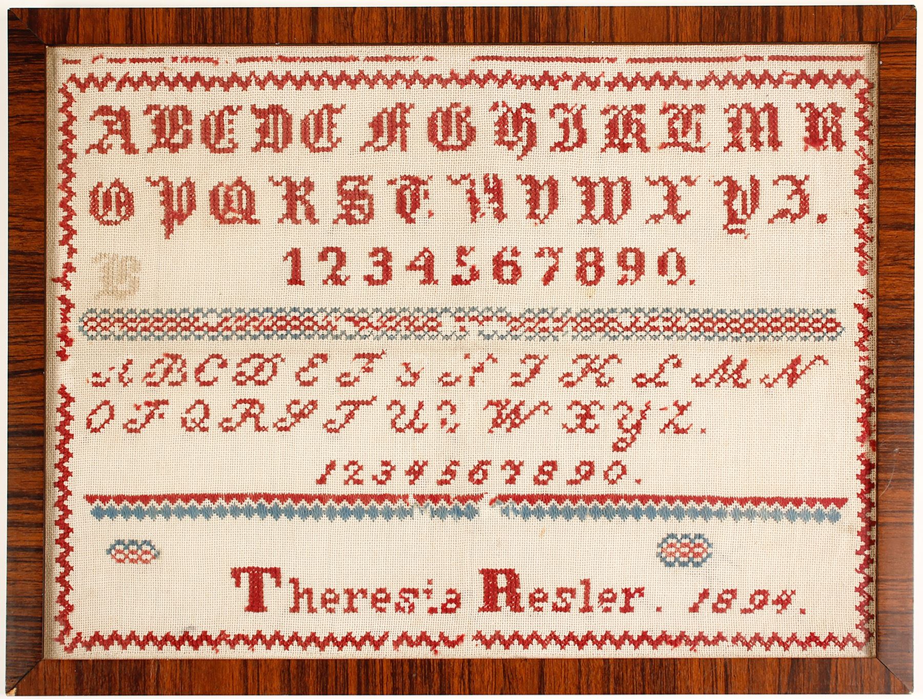 Sewing sampler, 1894. 19.5 x 15" framed sewing sampler using buff, bright red, and blue thread. Made by Theresa Ressler 1894. These samplers were a teaching tool for young ladies. Every house had one. State: City: Date: 1894