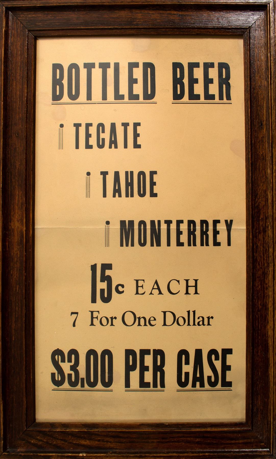 "Bottled Beer / Tecate / Tahoe / Monterey / 15c each / 7 for One Dollar / $3.00 per Case." 23.5 x 15.5 framed. This is reported to be a Union, Nevada piece. HWAC#: 48812 Date: