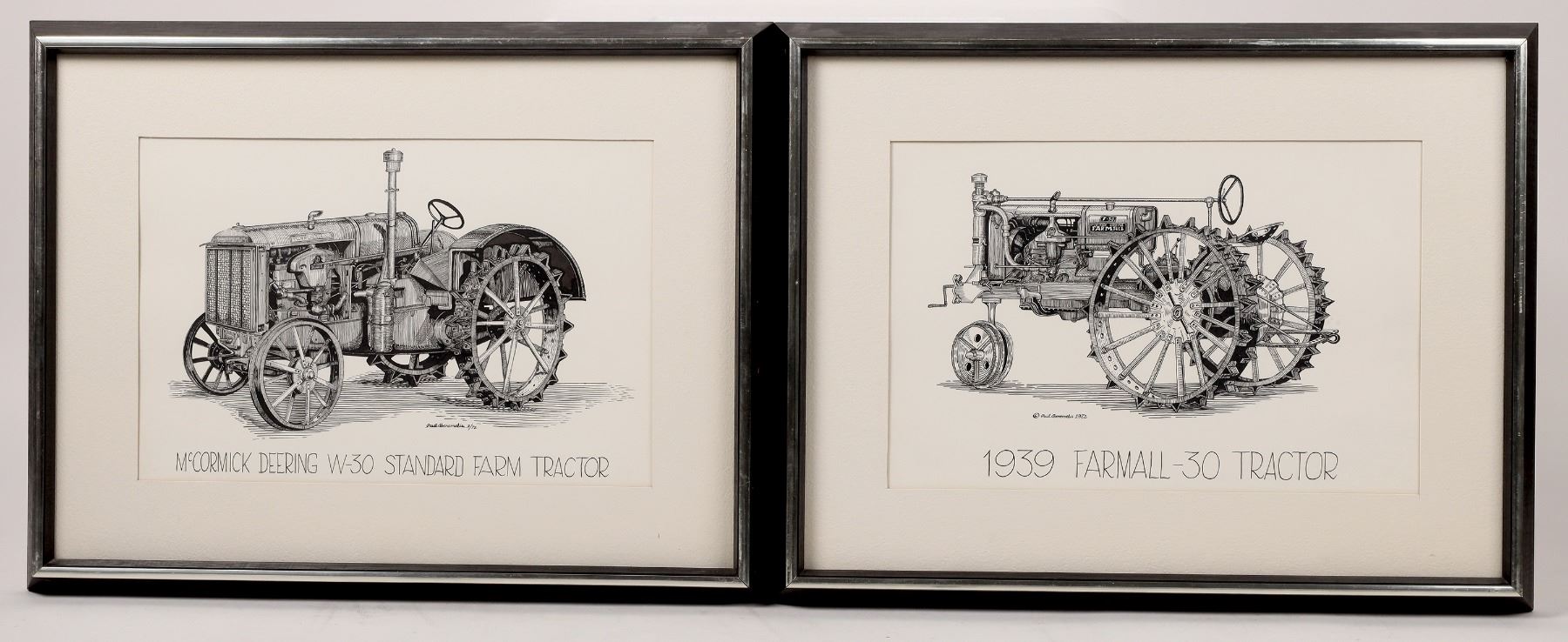 2 framed ink or etched black Paul Benemelis antique tractor prints from 1972. 1939 Farmall-30 and McCormick Deering W-30 Standard Farm Tractor. Prints 8x12".