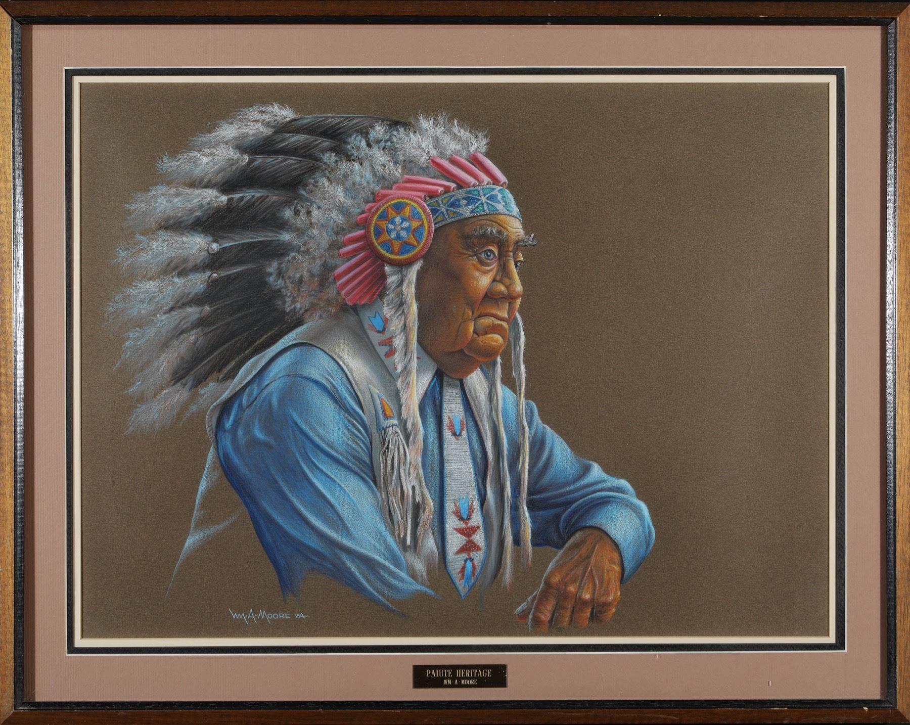 Original print signed at lower left W.A. Moore. Has brass, stamped plate at bottom center reads: Paiute Heritage/WM A Moore. This print is double matted. Print is 24" x 17.5". Framed is 29" x 23". Beautiful colors, predominantly blue (his shirt to go with his eyes). Wildlife, ancient cultures and the old west are subjects close to the heart of Nevada artist William A. Moore. After a career encompassing twenty-two years as a successful designer and commercial artist, Moore has turned to fine arts. The recipient of many awards, he is dedicated to realism, detail and accuracy. Moore's work has been featured on several Nevada television programs and in numerous national magazines, including ShotGun Sports, Nevada Magazine, Contemporary Western Artists and featured in Southwest Art Magazine. His paintings are in collections worldwide and in several national museums. William A. Moore was born in 1936 & passed away in 2010. In beautiful condition.