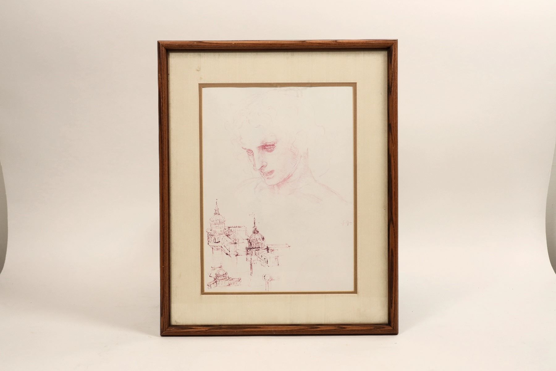 A framed sketch of a youthful face and intricate domed buildings in red ink. The sketches are loose and unfinished; they appear to be studies for a final portrait or painting. The sketches are not signed and there is no indication of the artist, but it is labelled with a handwritten '14'. Dimensions in the listing are those of the frame; the sketch itself is 10.75x14.5 inches.