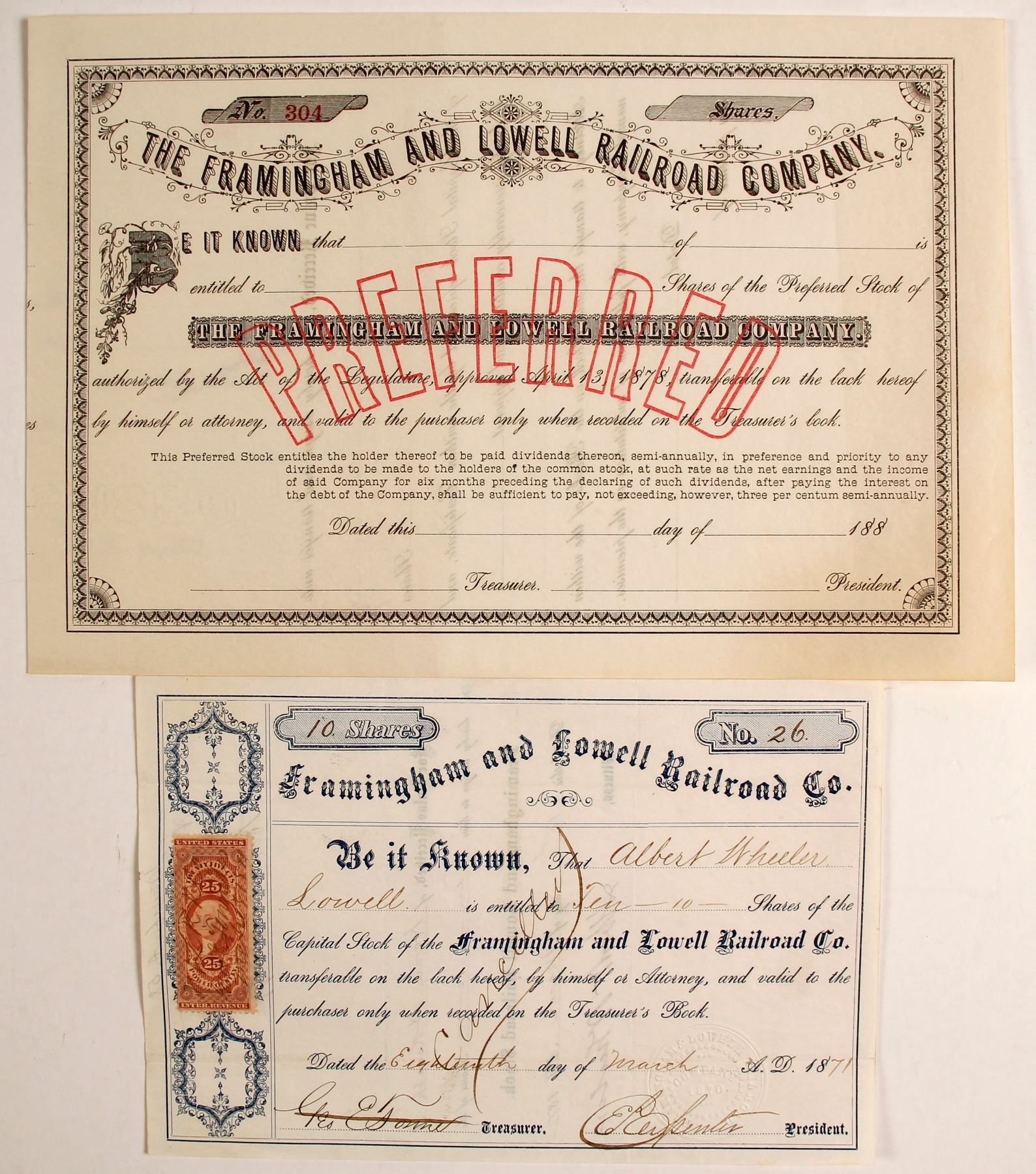 2) Non--Issued shares, number 304 of Preferred Stock. The Framingham and Lowell Railroad was a railroad in Middlesex County, Massachusetts. Incorporated in 1870 to provide a rail connection between railroad hub of Framingham and the mill city of Lowell, passing through the towns of Sudbury, Concord, Acton, Carlisle, Westford and Chelmsford. Opened October 1, 187 on 26.1 mile line.