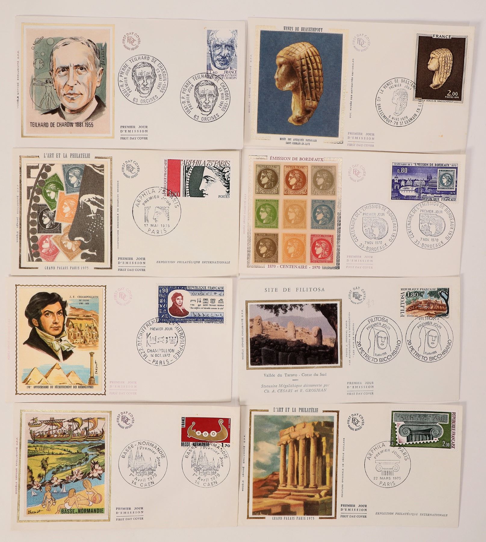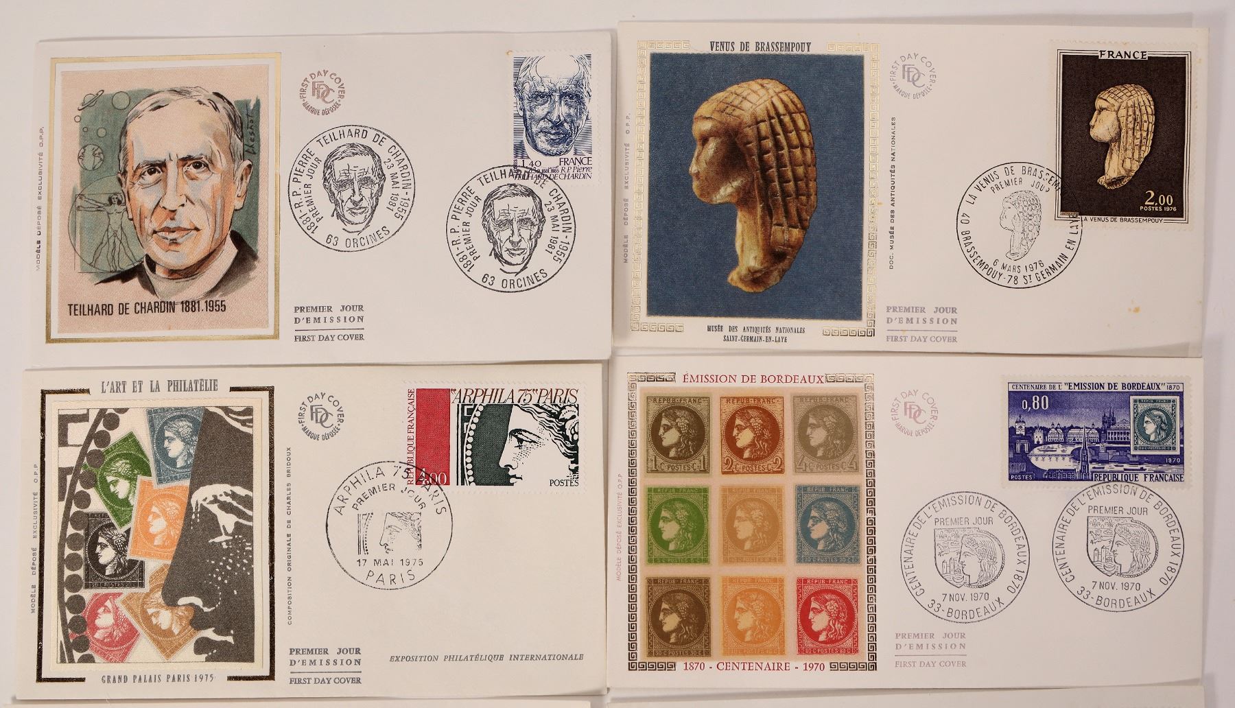 A collection of 8 First Day Commemorative Covers from France, c1970-86. All different cachets with coordinating postmarks & French adhesive stamps. Subjects include Normandy, art, landmarks, postal, museum piece & Pierre Teilhard de Chardin, who was a French Jesuit, Catholic priest, scientist, paleontologist, theologian, philosopher, & teacher.[ France