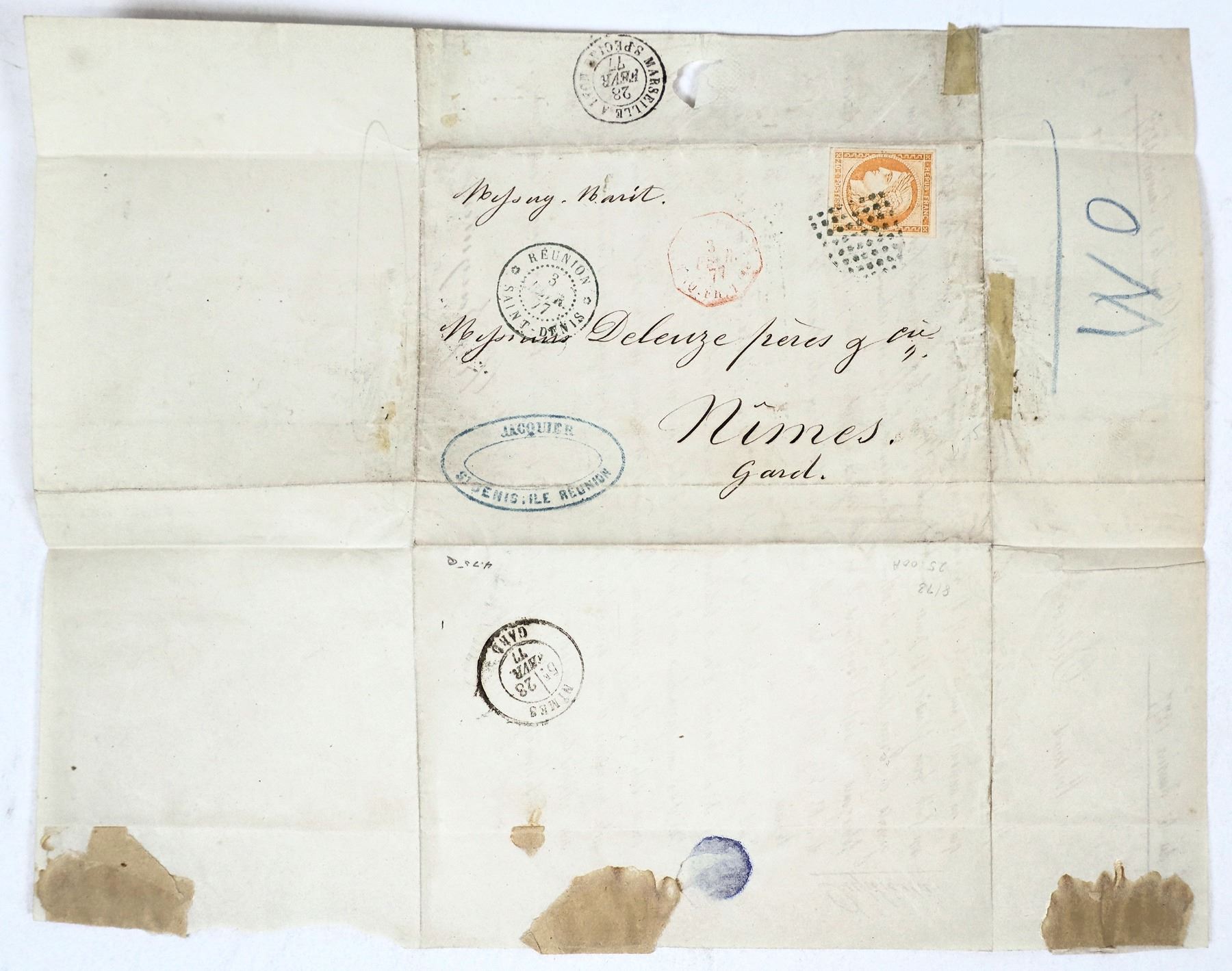 France/Reunion 1877 lettersheet to Nimes France franked with France Bordeaux 40c )Scott 347, four good margins) tied by diamond of dots, alongside St. Denis datestamp and commercial cachet with partial PAQ. FR. transit, scarce and pretty single franking.