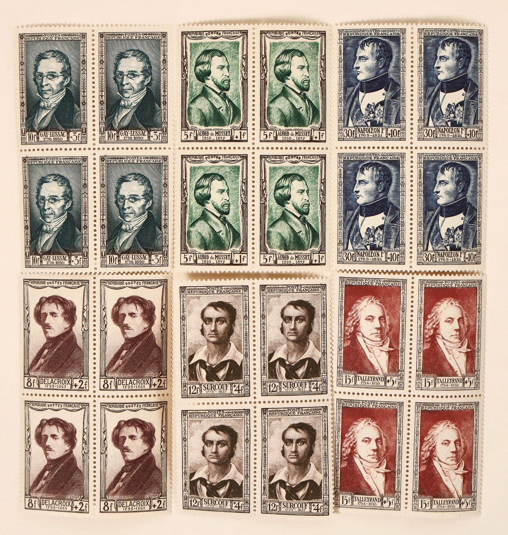 France, Scott 258-263 XF mint blocks of 4. 1 has a light hinge mark, the rest are OG NH.