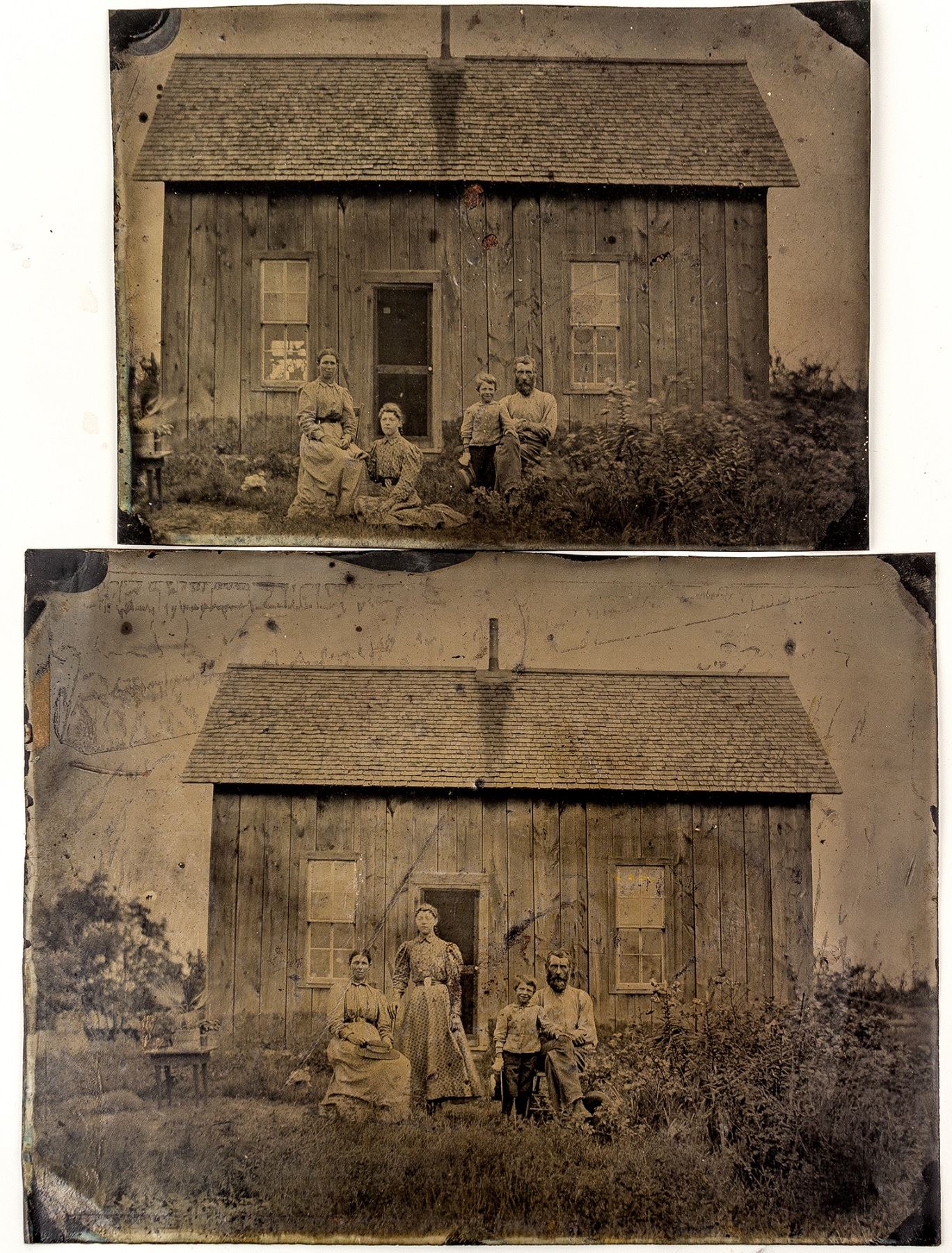 Very early. Very historical. Photos show a bearded man, two women and a boy in front of a wooden cabin surrounded by grass bushes & trees in the background. 1) 1/2 plate tin photo. 6.5 x 8.5". On reverse is a piece of paper glued on with penciled identification. 2) 1/4 tin plate. 5 x 7". No identification, but same group, State: California City: Volcano HWAC#: 37262 Date: c1860-1865