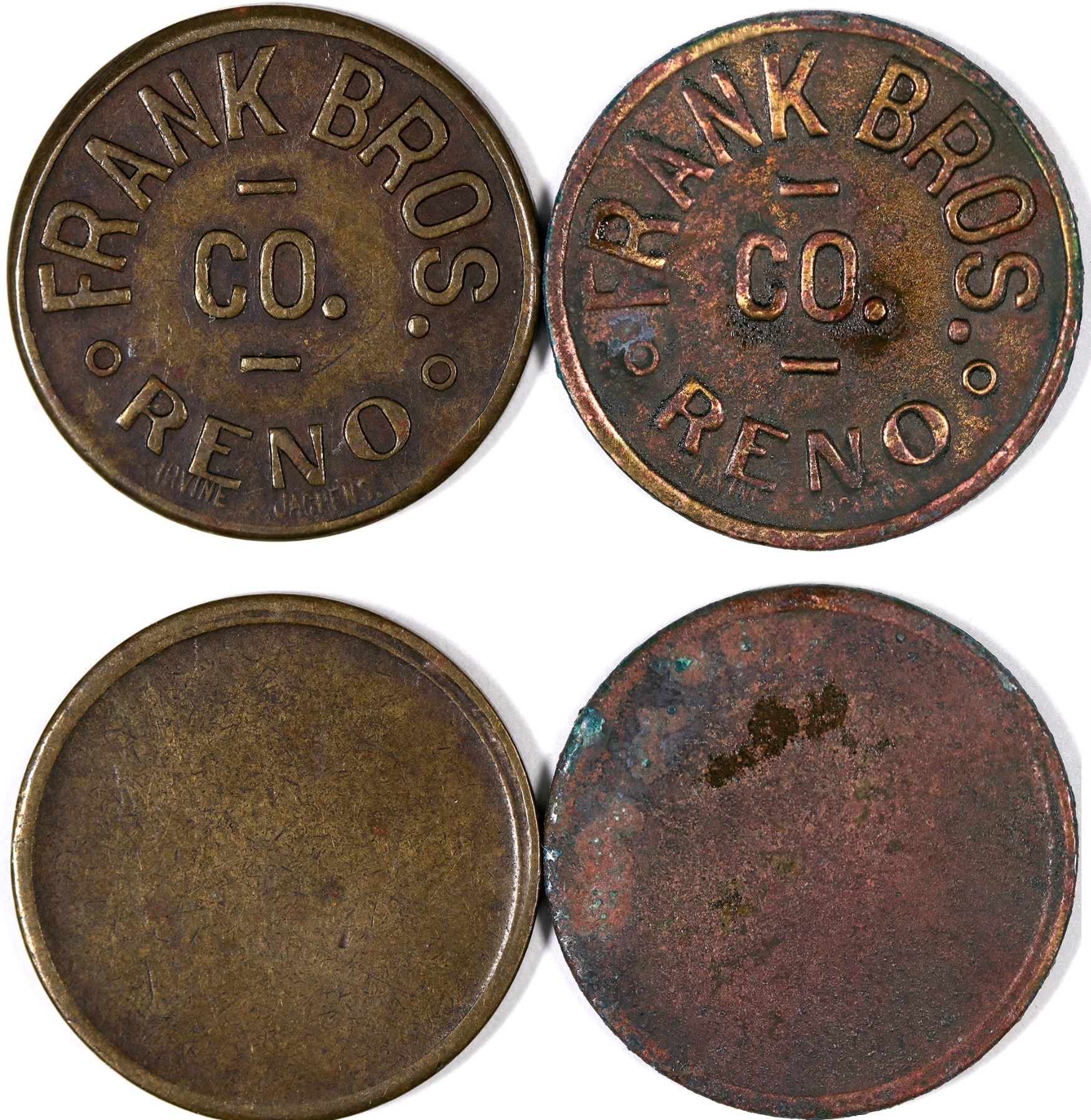 Lot of two: FRANK BROS. / CO. / RENO / / (blank). Br. rd., 21 mm. Operated by Ben and Myron Frank beginning in 1892 at 228 North Virginia Street, a saloon and Anheuser Busch bottling depot. Newspaper ads ran through 1906.