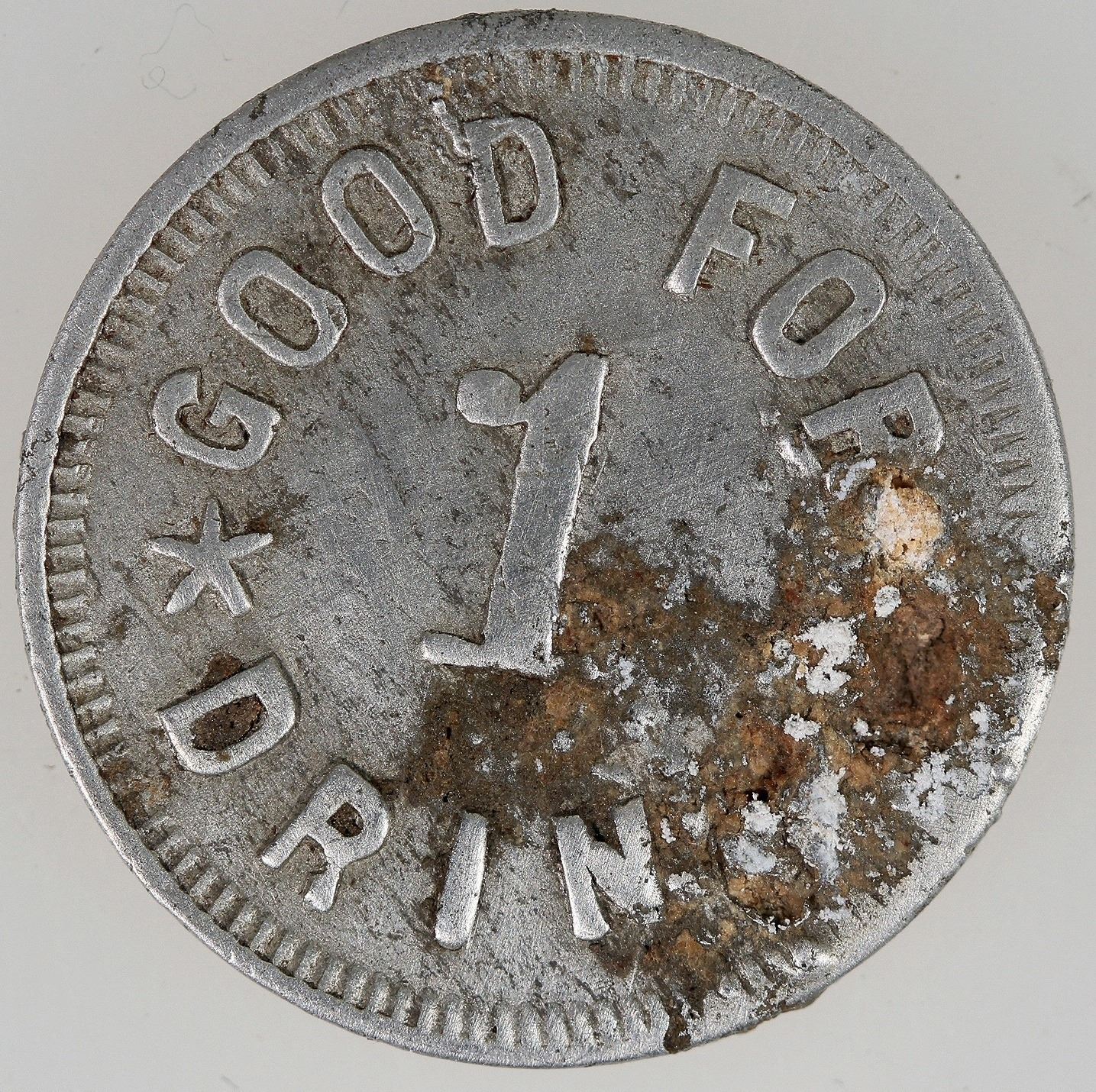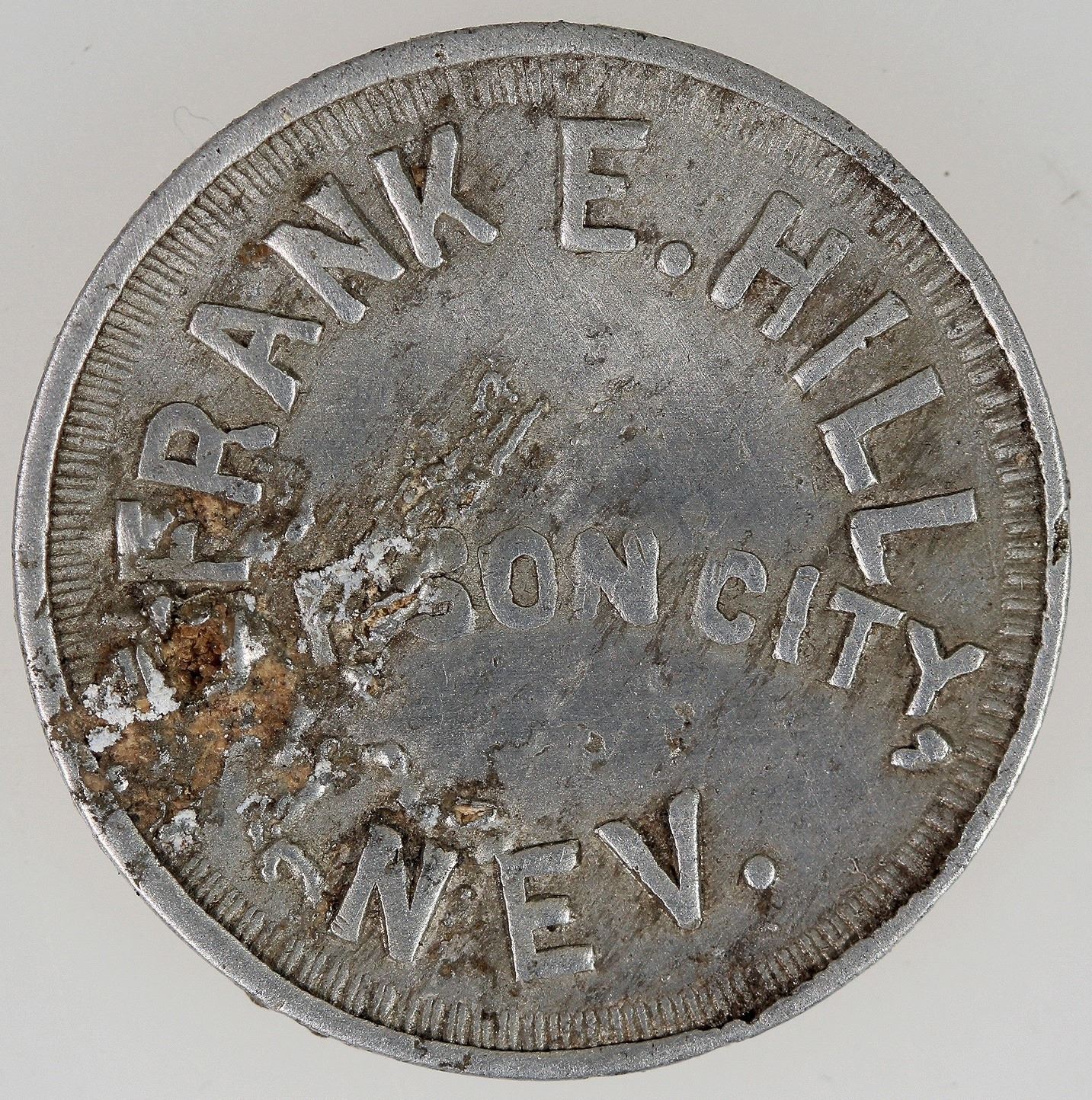 Rare Carson City saloon keeper token: FRANK E. HILL / CARSON CITY, / NEV. // GOOD FOR / 1 / DRINK; Al., rd., 21 mm.