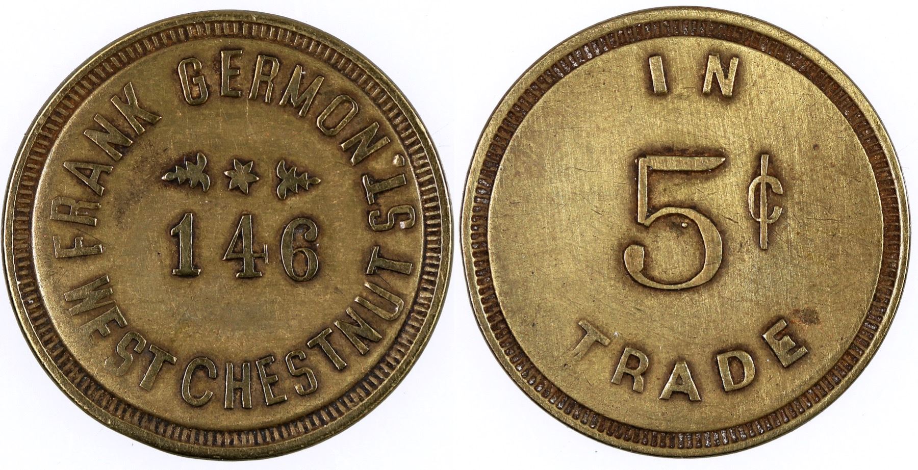 This proprietor also made a jug (W/ 5173). This token: FRANK GERMON / 146 / WEST CHESTNUT ST. // IN / 5¢ / TRADE; Br., rd., 24 mm.