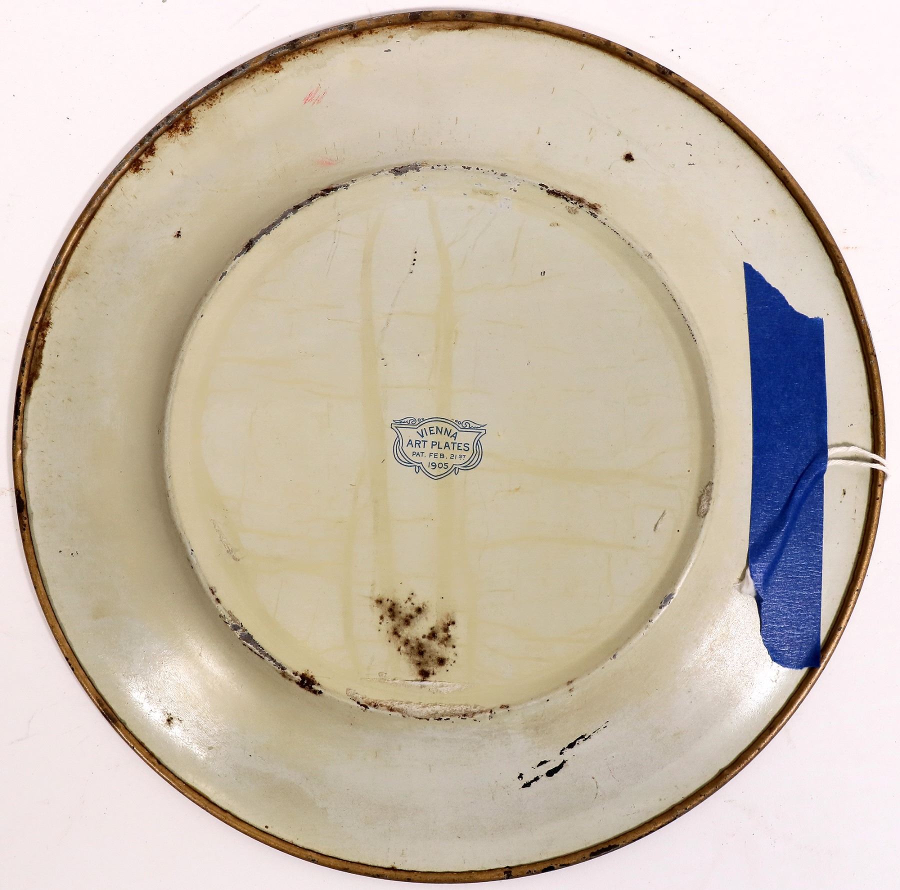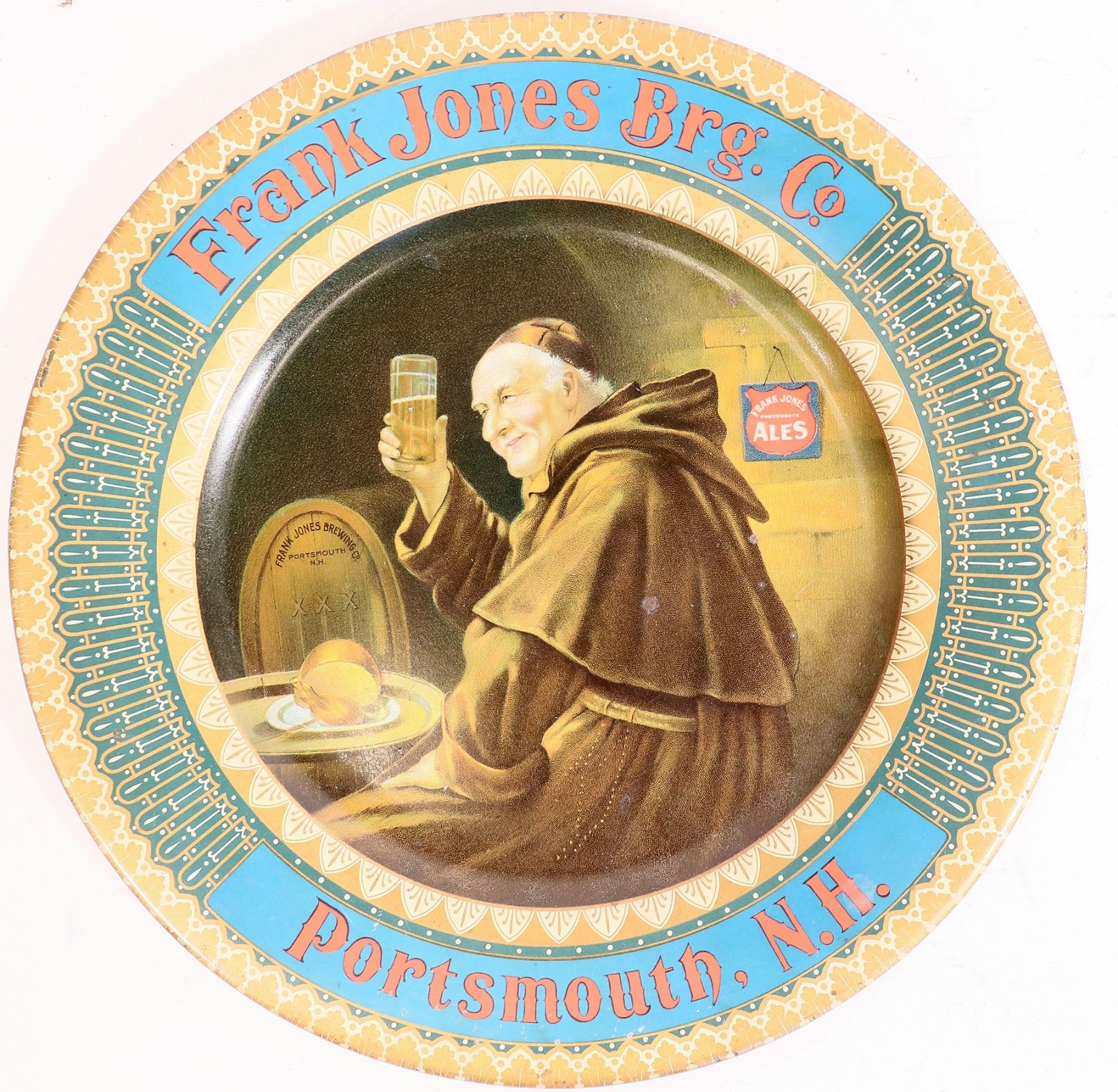 This beer tray for a single glass is from the "Frank Jones Brg. Co./ Portsmouth, N. H." is 10 in. across. One of the oldest breweries in New Hampshire and certainly the largest. Pre-Pro. Depicting a monk enjoying his beer with a meal. Gold tone border, very good condition. The back is marked "Vienna Art Plates/ pat. Feb. 21st, 1905. C. 1910's. Portsmouth New Hampshire
