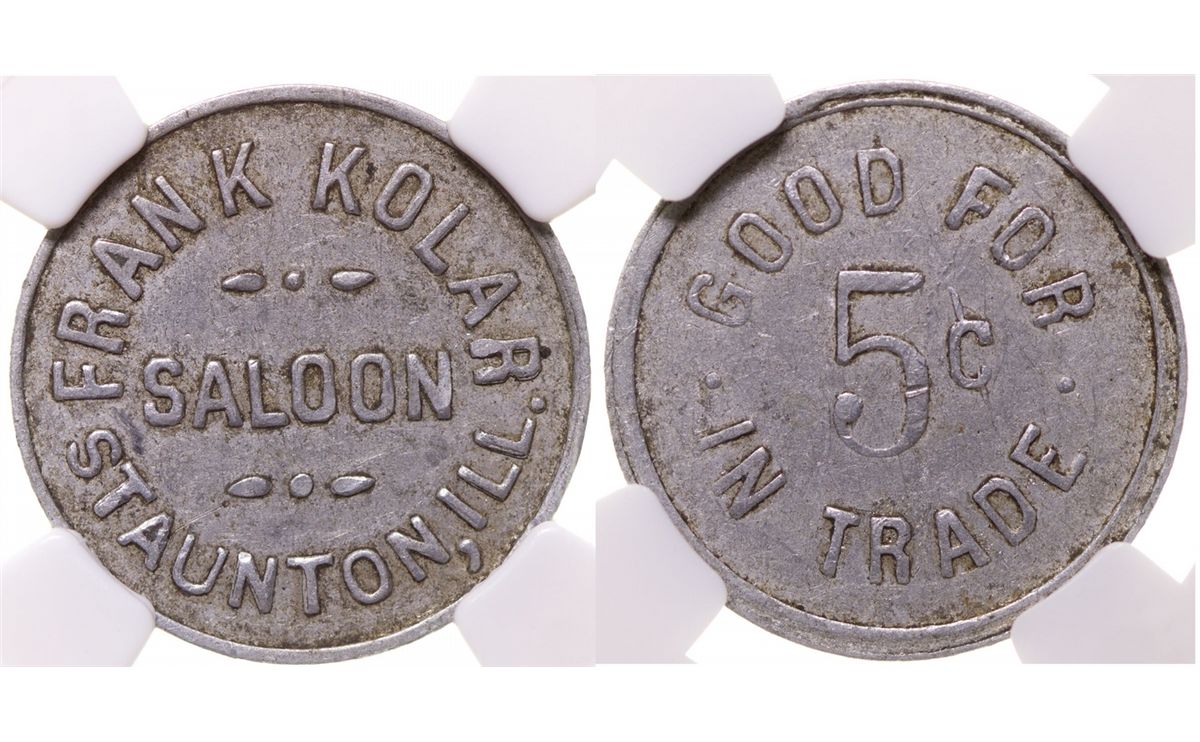 Frank Kolar Saloon, Staunton, Ill. // GF 5c IT Date: c 1910 Staunton IL hwac 20770