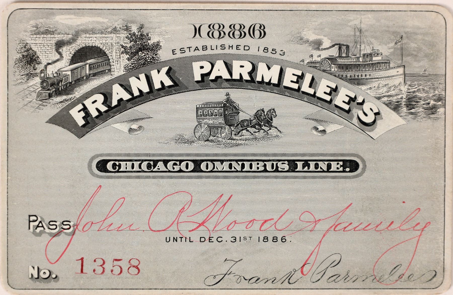 No. 1358, issued to John R. Wood & family for 1886. Signed by Frank Parmelee. Vignettes of steamship, train, and wagon. Printed on cardstock. Very good condition. The Parmelee Company was an omnibus line that ferried passengers and their belongings from one train terminal to another in Chicago. Franklin Parmelee (1816-1904) began the business in the 1850s.