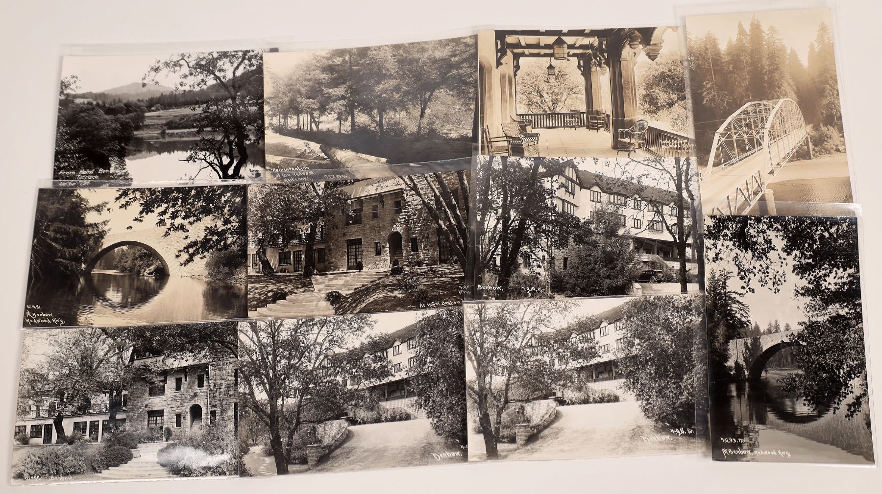 Lot of 11, ten different. Hotel Benbow is a world famous hotel on the Eel River in the Avenue of the Giants, Humboldt County, California. Includes: 4 different exterior views; three bridge views; hotel patio; reincarnation of the Redwood; and from the Hotel Benbow terrace. Frank Patterson (1883-1961) was a prolific photographer who worked in studios in Medford, Oregon and Santa Rosa and San Francisco, California during the 1920s-1950s. His work focused on Oregon and Northern California.