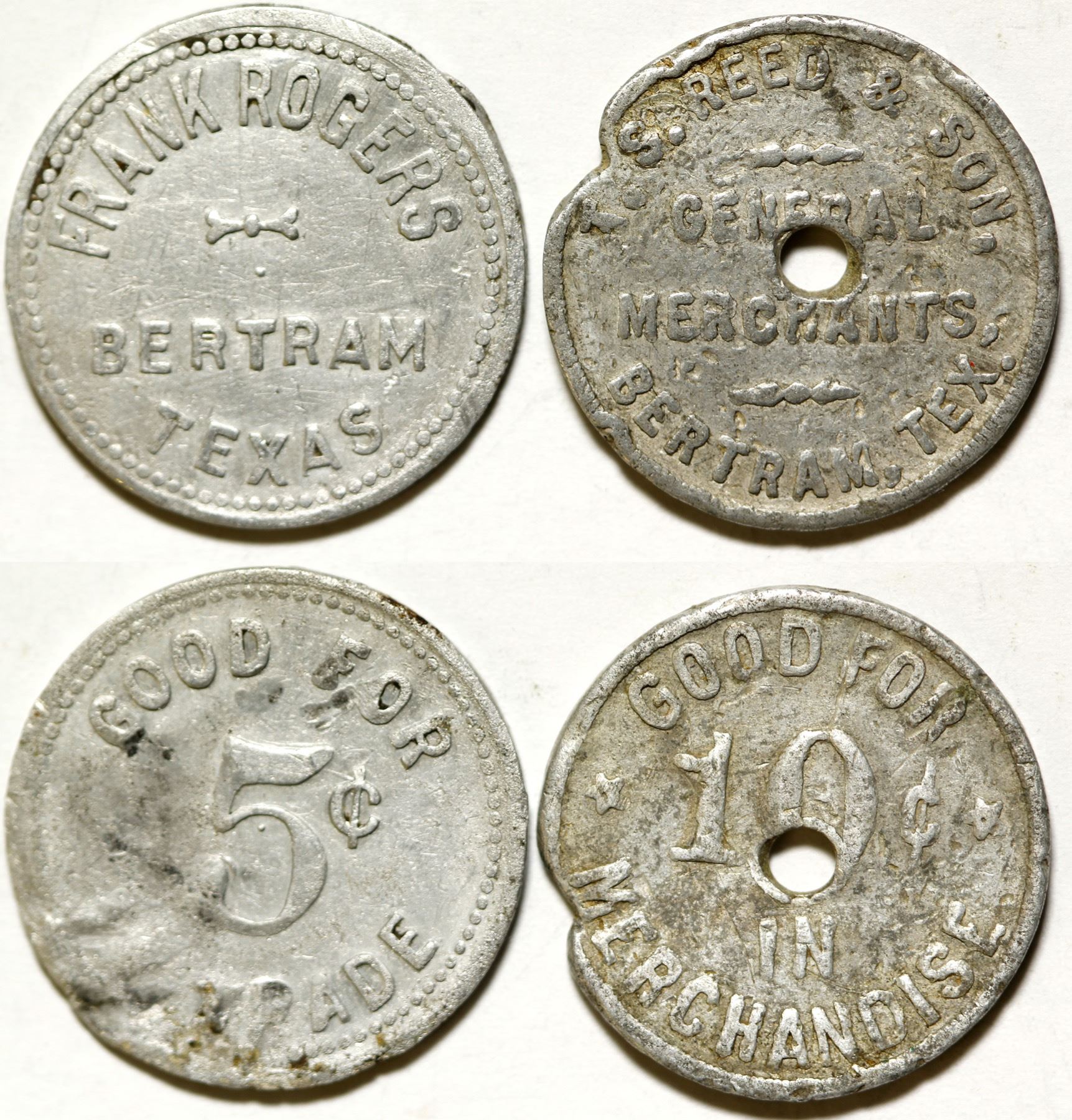 Lot of two: 1) Obv.: Frank Rogers/ Bertram / Texas; Rev.: Good For / 5c/ In Trade. Al., rd., 23 mm. 2) Obv.: T.S. Reed & Son / General / Merchants / Bertram, Tex.; Rev.: Good For / 10c / In / Merchandise. Wm, rd., holed, 21 mm. State: Texas City: Bertram Date: HWAC# 82473