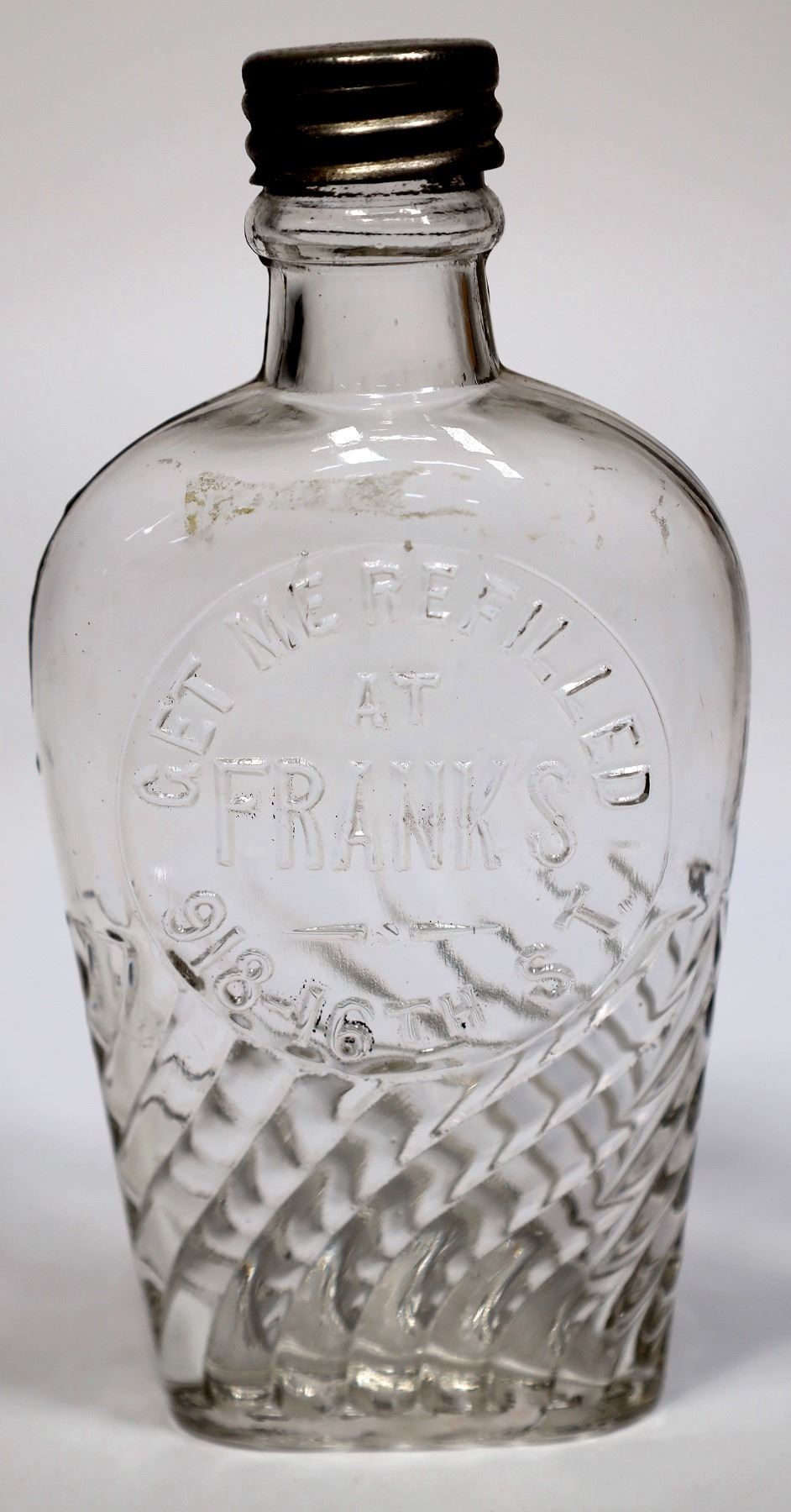 Not in Preble. Get Me Refilled / At / Frank's / 918-16th St. Clear glass, 6", ground top with metal cap. Wavy raised pattern on bottom third. Chips on lip, some adhesive residue. Please inspect.