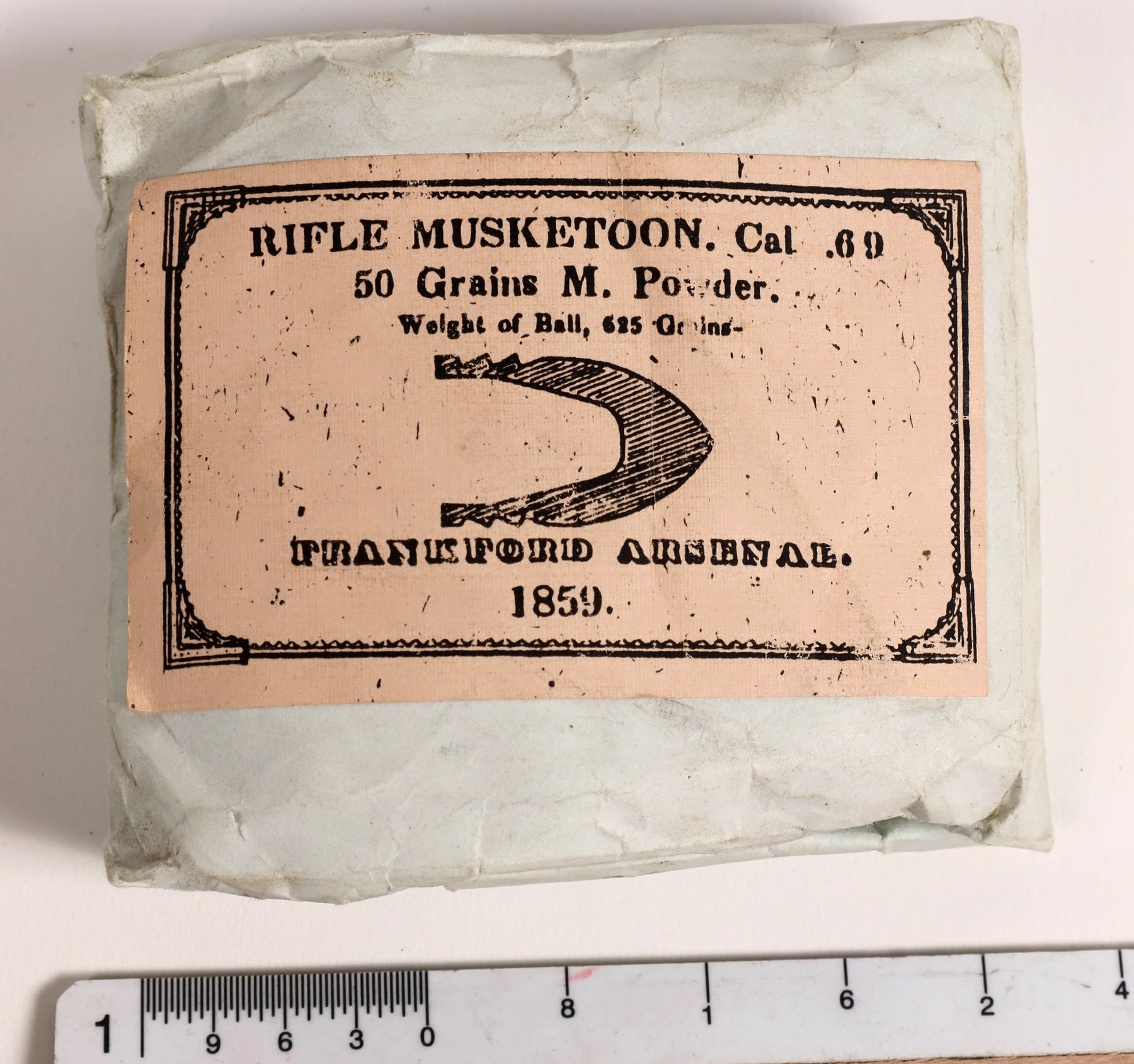 This is an original packet of .69 cal. rifle rounds with 50 Grains of powder weight of ball 625 grs. Dated 1859. In excellent condition. No sales to New York, New Jersey, California, Hawaii, or Alaska. No international sales. Additional shipping fees apply. Please see photos for details.