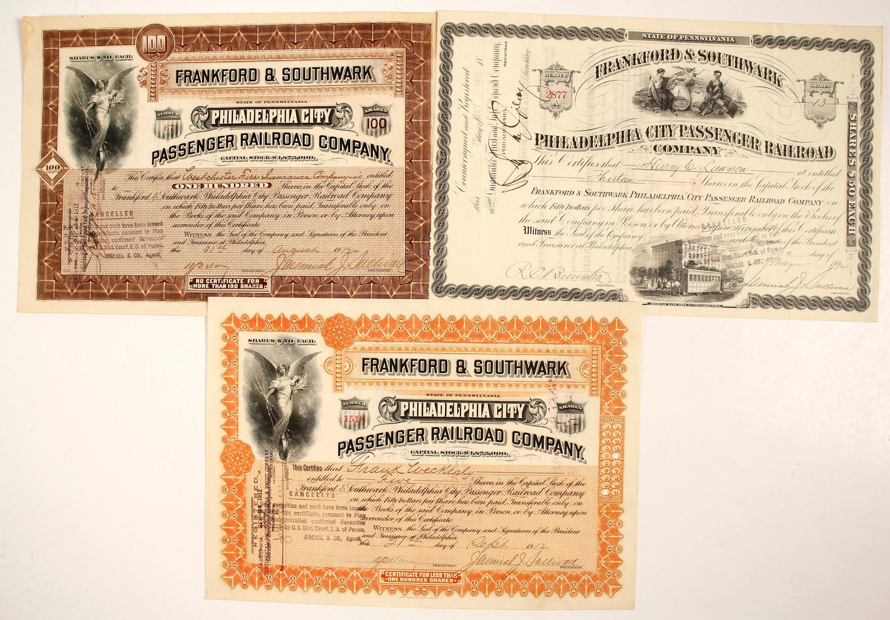 Three cancelled stock certificates for Frankford & Southwark Passenger Railroad Company. 1) Stock Number 1518 for five shares dated Sept 21, 1912 2) Stock Number 67 for 100 shares dated August 31, 1912 3) Stock Number 2877 for 13 shares dated May 26, 1894