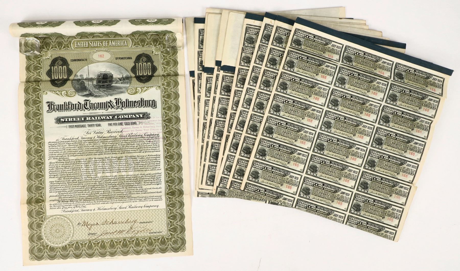 $1000 first mortgage thirty year five per cent gold bonds (10) issued by the Frankford, Tacony & Holmesburg Street Railway Company. Street car vignette; coupons; green ink. The company was nicknamed the "Hop Toad and Frog".