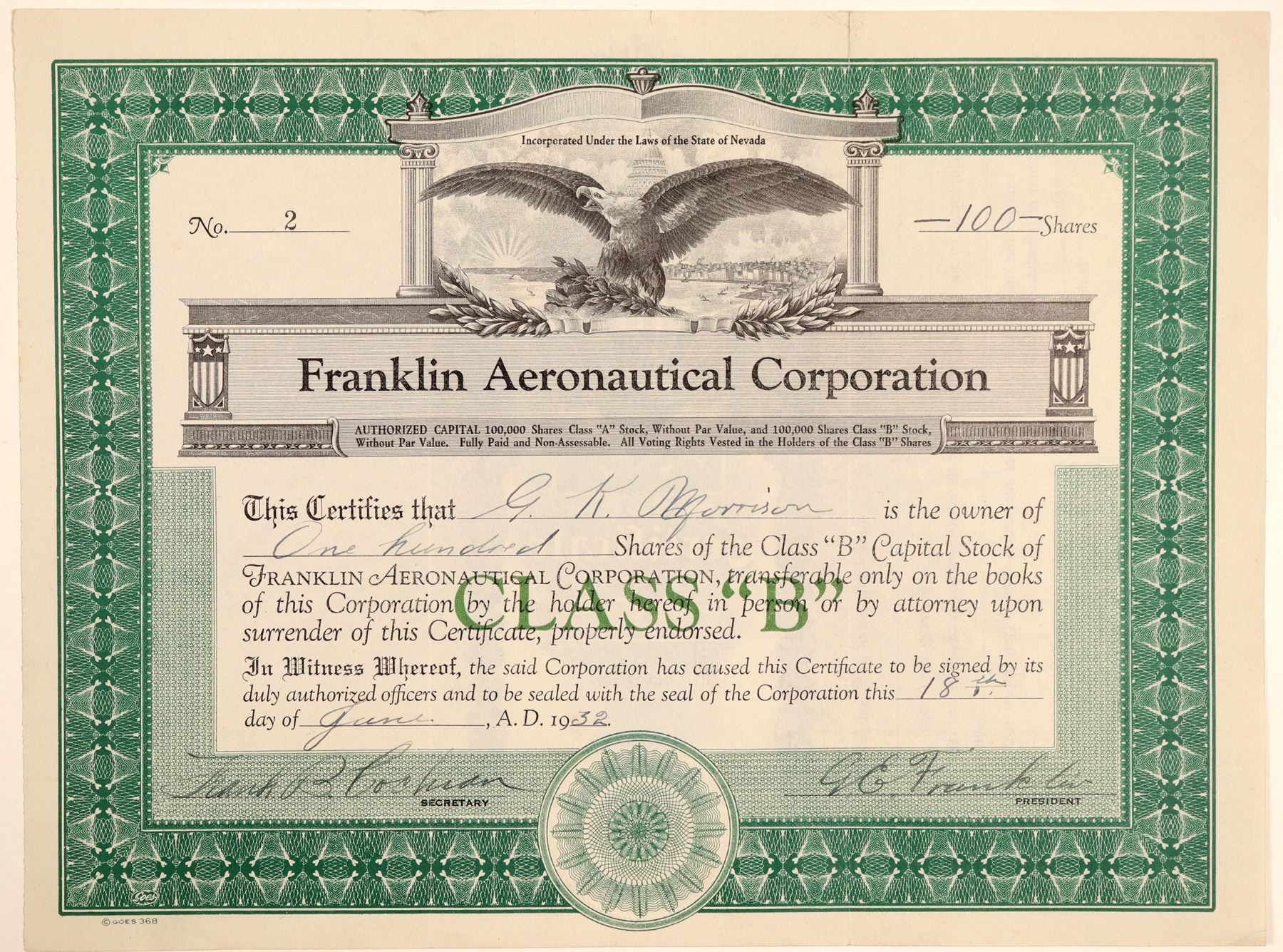 Stock number 2! Inc. in Nevada. Issued for 100 shares to GK Morrison on June 18th, 1932. Signed by president GE Franklin and secretary Frank Cochran. Not cancelled. Green border, black print, bald eagle vignette. Printed by Goes. 8.5 x 11" Heavy folds. They made an airplane engine with 16 air cooled cylinders without valves and 400 horsepower (according to a 1929 Popular Science article). Ken Prag Collection