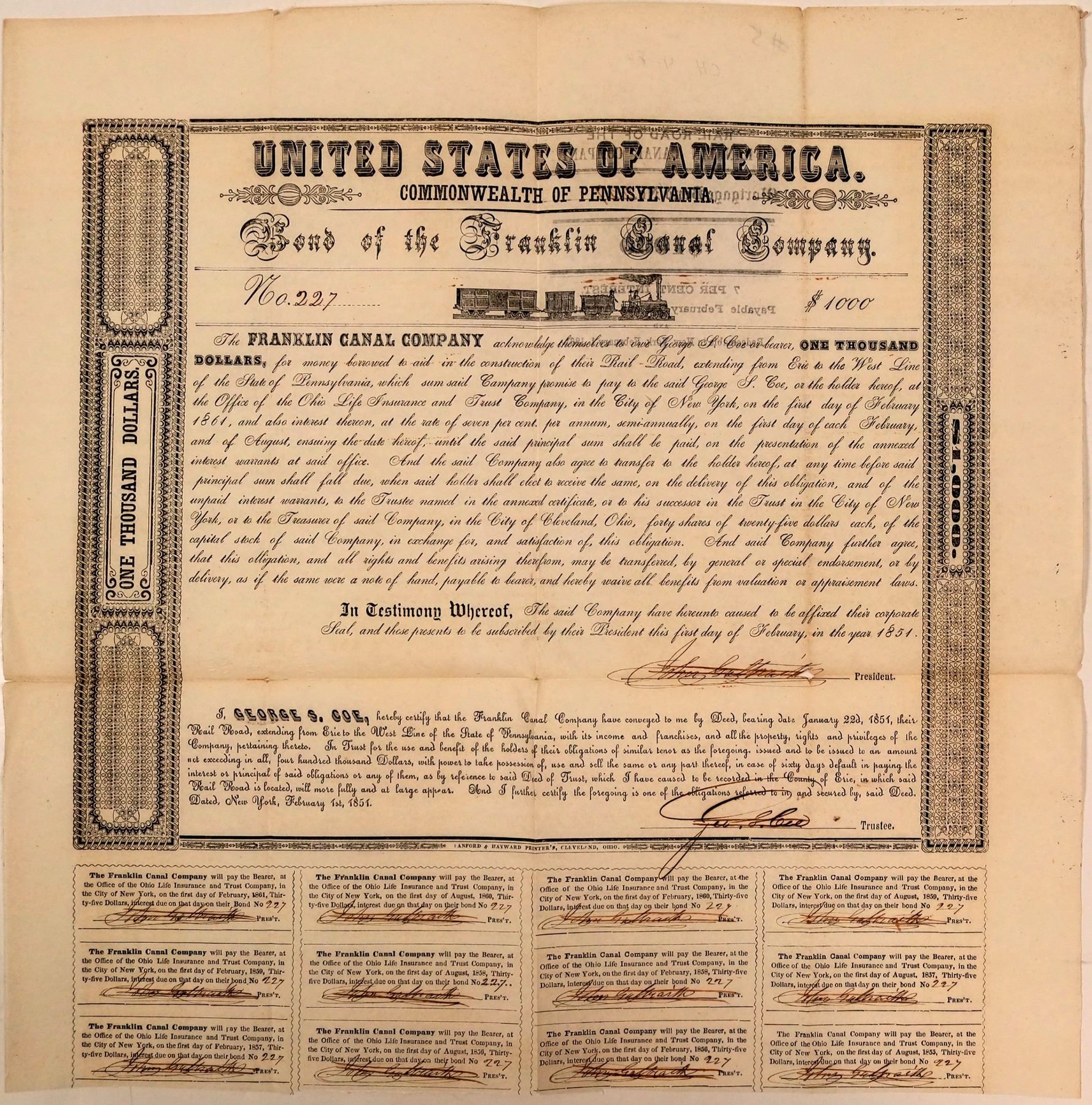 Cert. #227, $1,000 bond issued in 1851. Small train vignette. Twelve coupons at the bottom. Mortgage bond from the Rail Road of the Franklin Canal Company, 7%, redeemable in 1861. Issued in aid in the construction of their railroad. Not listed in Cox. Line cxls. thru signatures with tiny hole thru president's signature. Very rare.