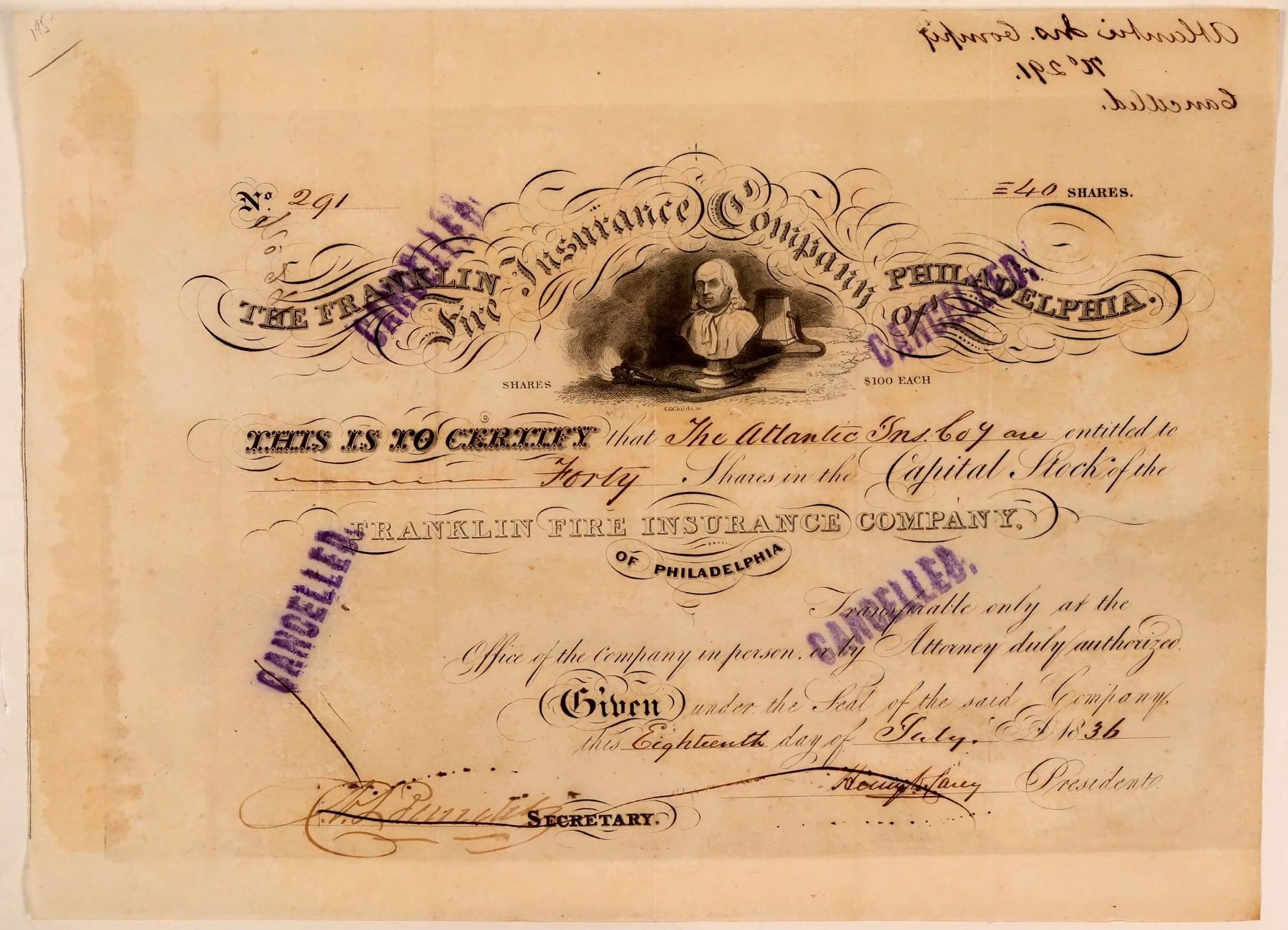 Early! Stock No. 291, issued for 40 shares to The Atlantic Fire Insurance Company on July 18th, 1836, in Philadelphia. Signed by the president and secretary. Pen and stamp cancelled. Black print on tissue paper with vignette of Benjamin Franklin bust, torch, and fire extinguisher(?). Folds, some discoloration. 8 x 11 inches. Pennsylvania Philadelphia 1836