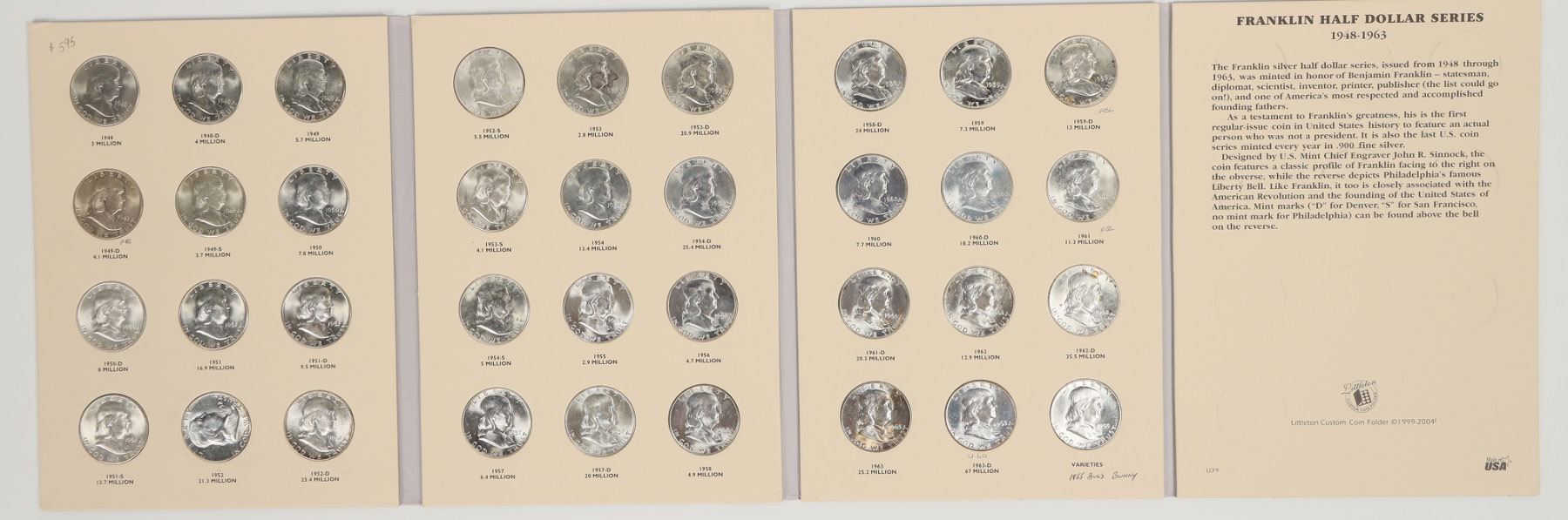 Green Littleton Custom Coin Folder with the entire set of 36 brilliant uncirculated Franklin half dollars from 1948-1963 with an additional 1955 Bugs Bunny example (a die clash gave the appearance of buck teeth, but it's barely noticeable).