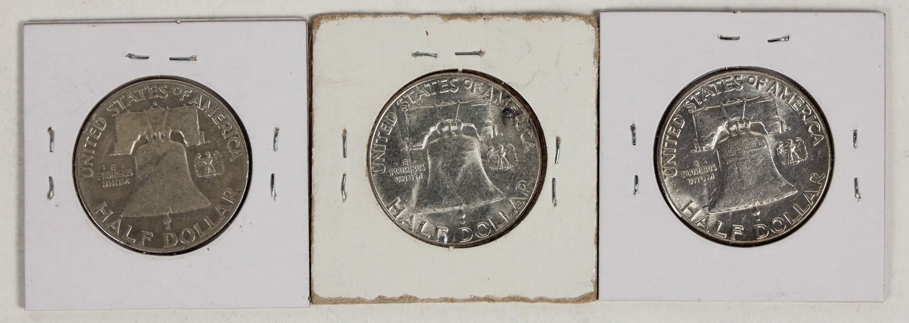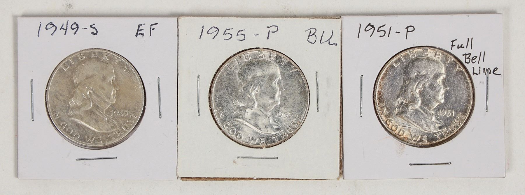 Lot of three Franklin half dollars: 1949-S (EF); 1951 BU full bell lines; 1955 BU.