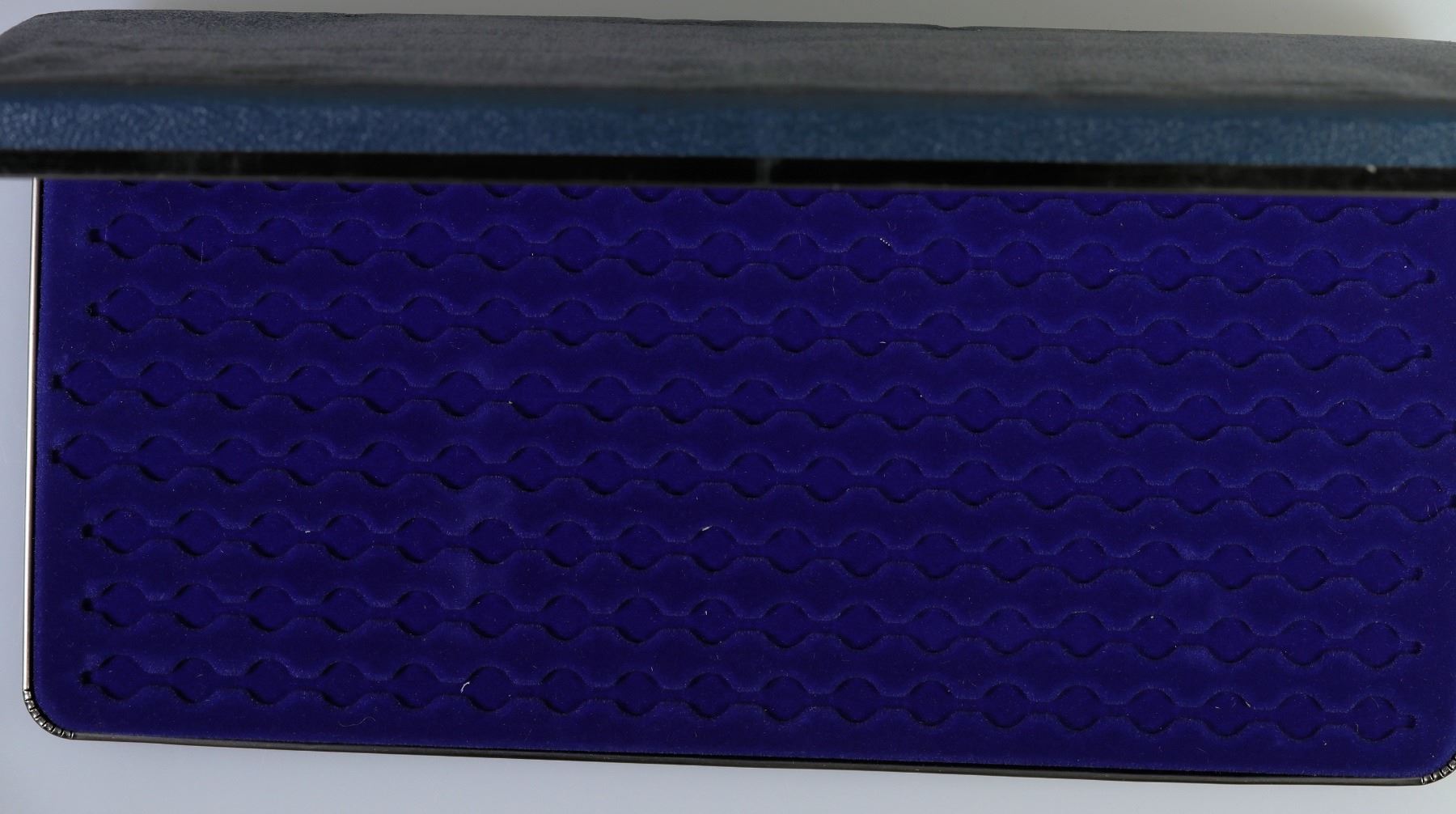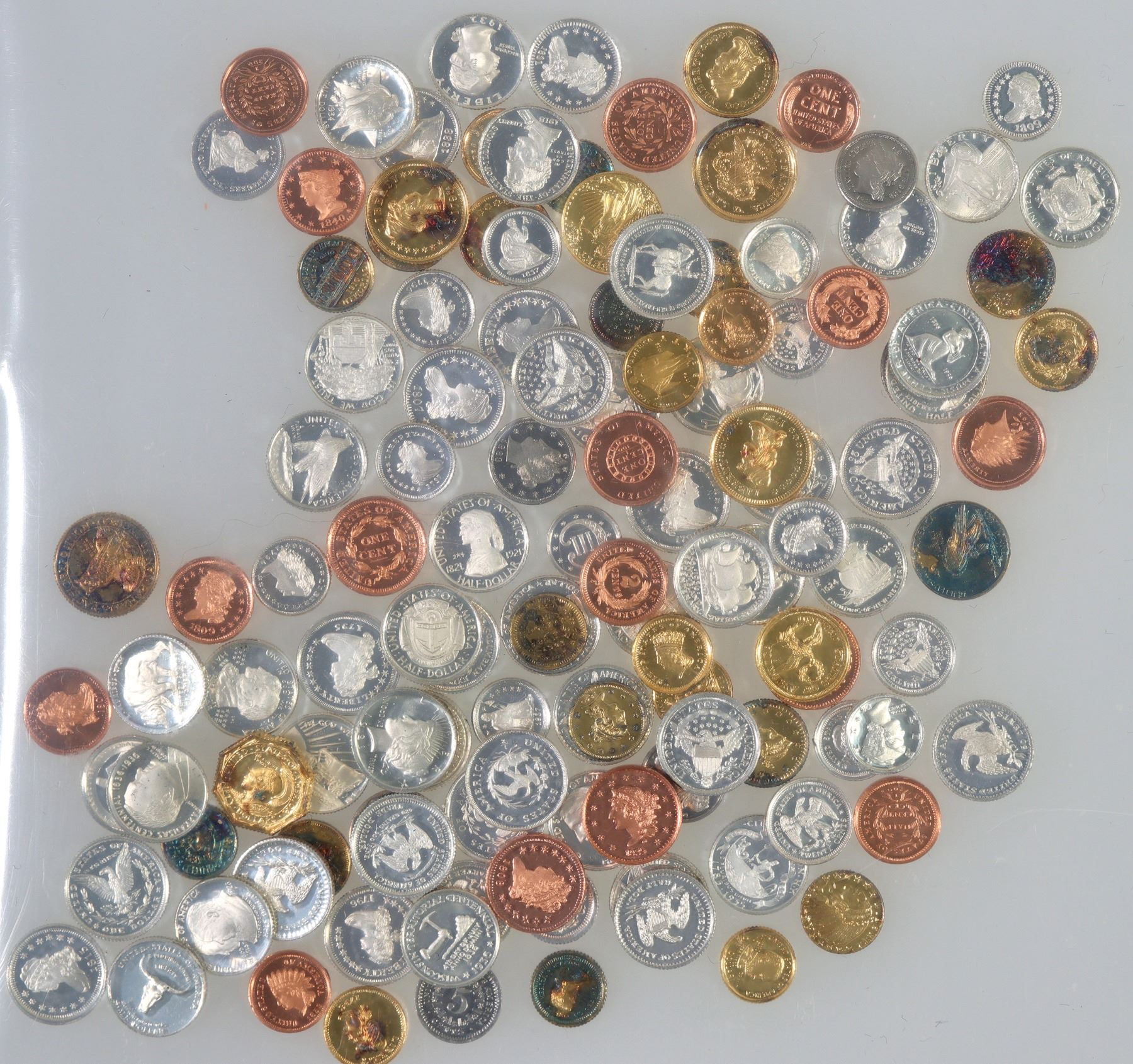 Partial set (124 coins) of the146 finely crafted and individually minted miniature coins produced by the Franklin Mint, one of every type of coin minted by the United States from 1792, through the Susan B. Anthony dollar in 1979. 92 of the coins are composed of 100% sterling silver; 31 are solid sterling with gold electroplate; 17 are copper; 6 are cupro-nickel. Set comes in its original metal presentation case, lined with blue felt, with a molded nest for each coin. The leatherette finish of the case has some minor discolorations. A clear, ridged plastic protector sheet to hold the coins in place when the case is closed.