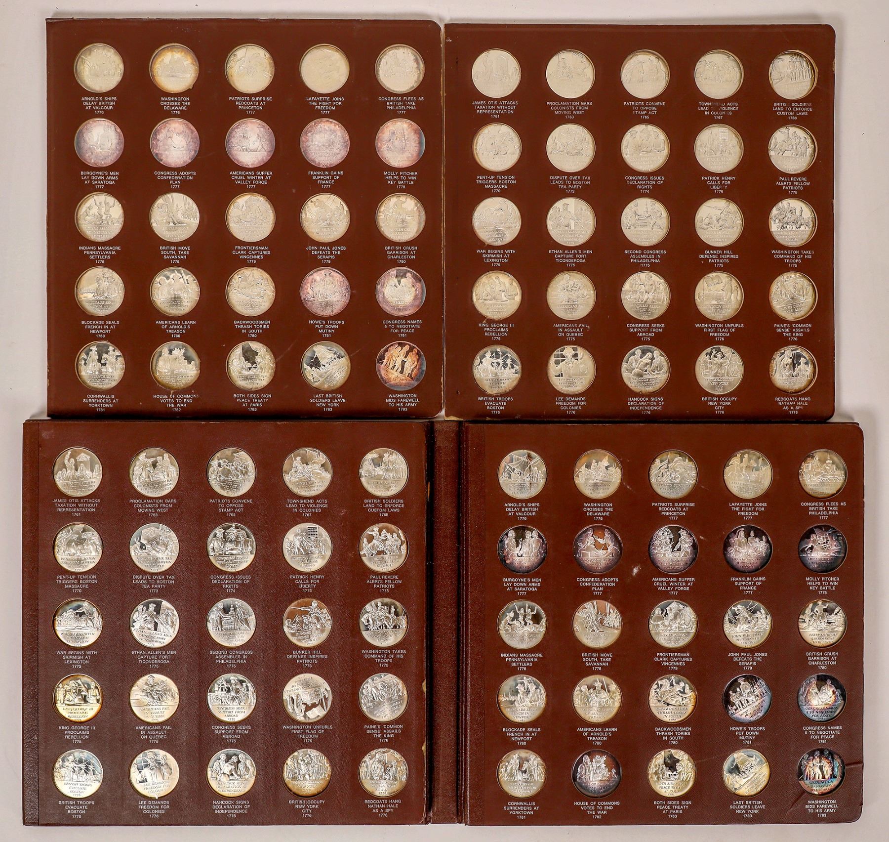 The Franklin Mint History of the American Revolution, first edition solid sterling silver proof set, two sets, one is in the album, the other set is two loose pages. One hundred medals total, each 32 mm and 14.5 grams of .925 silver. Approximately 50 ounces of silver. Some toning.
