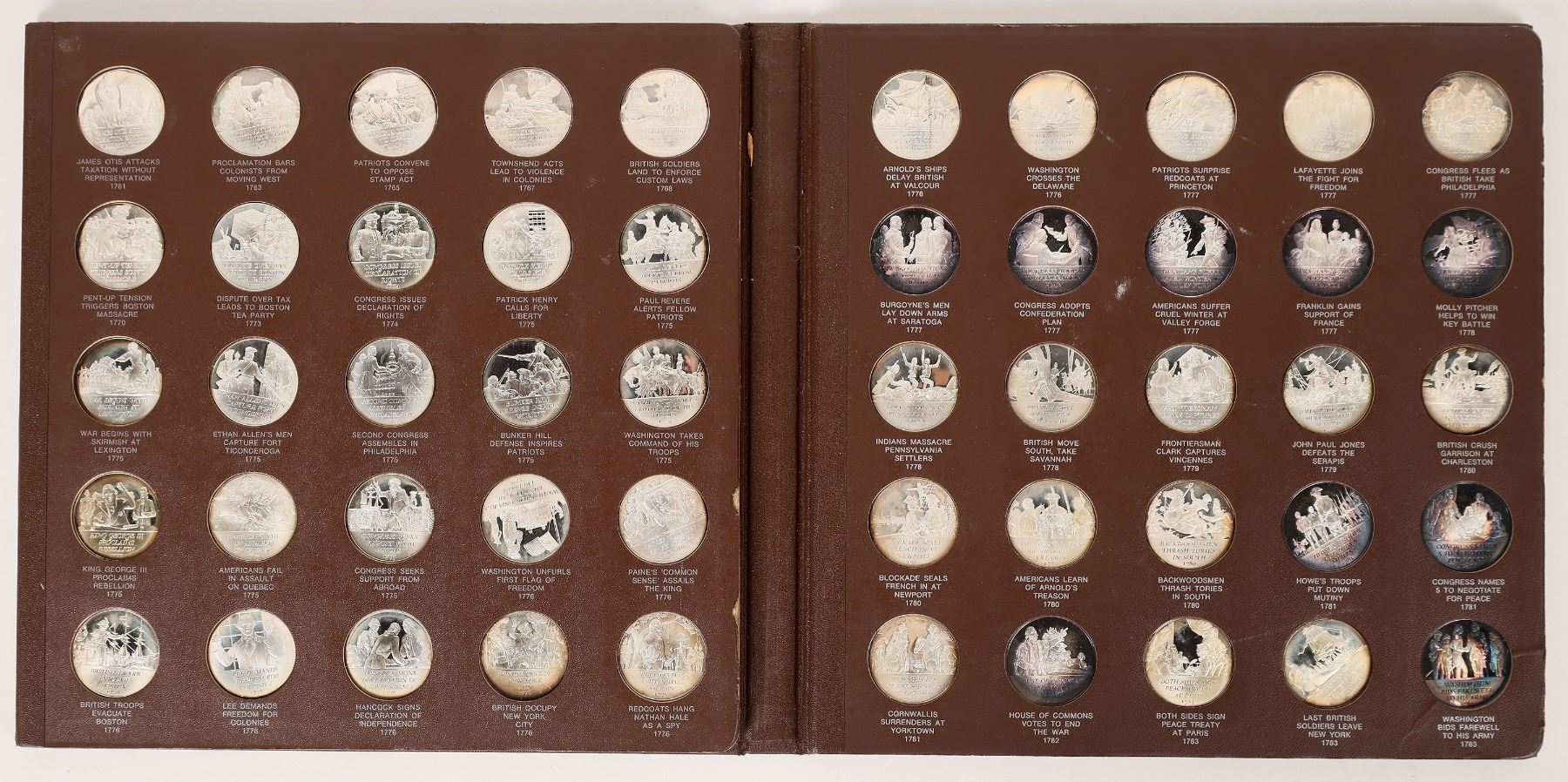 The Franklin Mint History of the American Revolution, first edition solid sterling silver proof set, in the album. Fifty medals total, each 32 mm and 14.5 grams of .925 silver. Approximately 25 ounces of silver. Some toning.