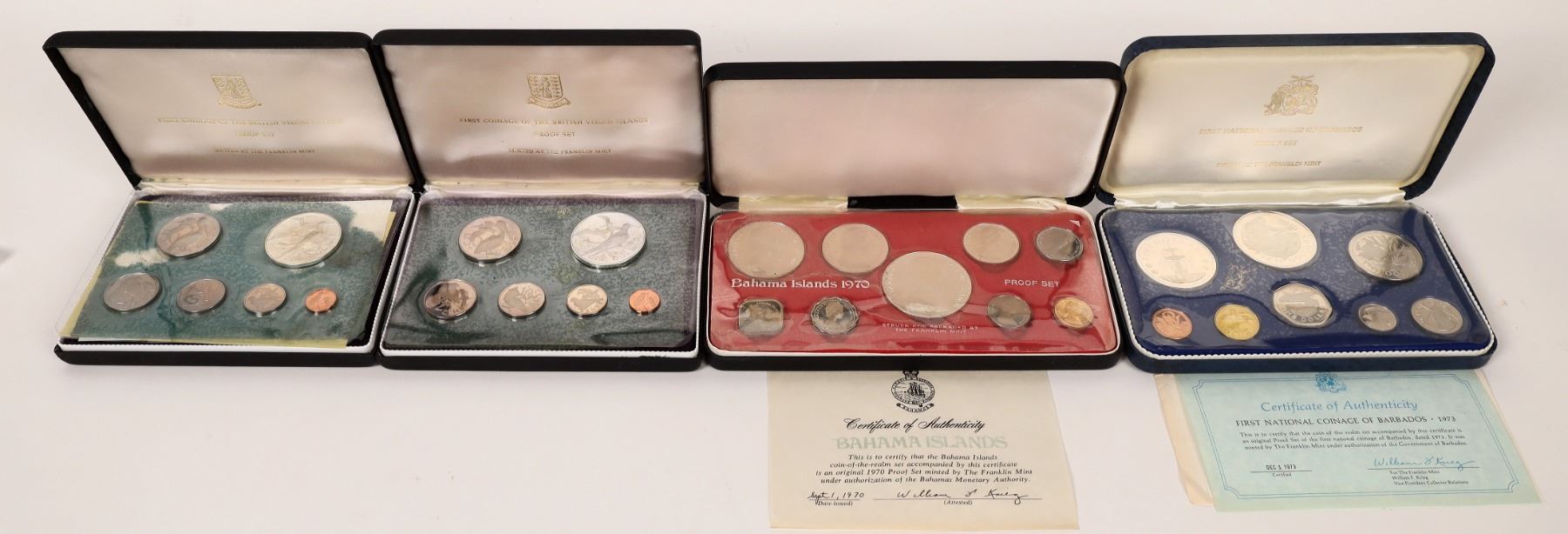 Lot of four proof sets made by the Franklin Mint for island nations of the Caribbean: 1973 British Virgin Islands (2 six coin sets); 1973 First National Coinage of Barbados (8 coin set); 1970 Bahama Islands (9 coin set).