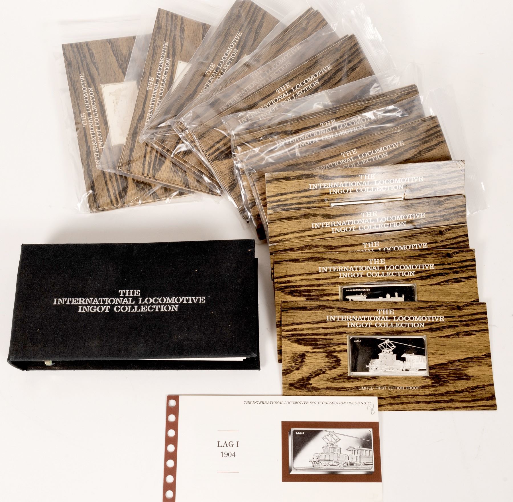 Issued in 1974 by Franklin Mint. Silver ingots commemorating the great locomotives in railroad history. Forty ingots are included with the brochure describing each engine. With a mintage of just 3763, the full sized ingots are not seen as often as the mini ingots also made. Each ingot is 3 x 1.5 inches and weighs 900 grains of sterling silver. (2.05714 oz.)