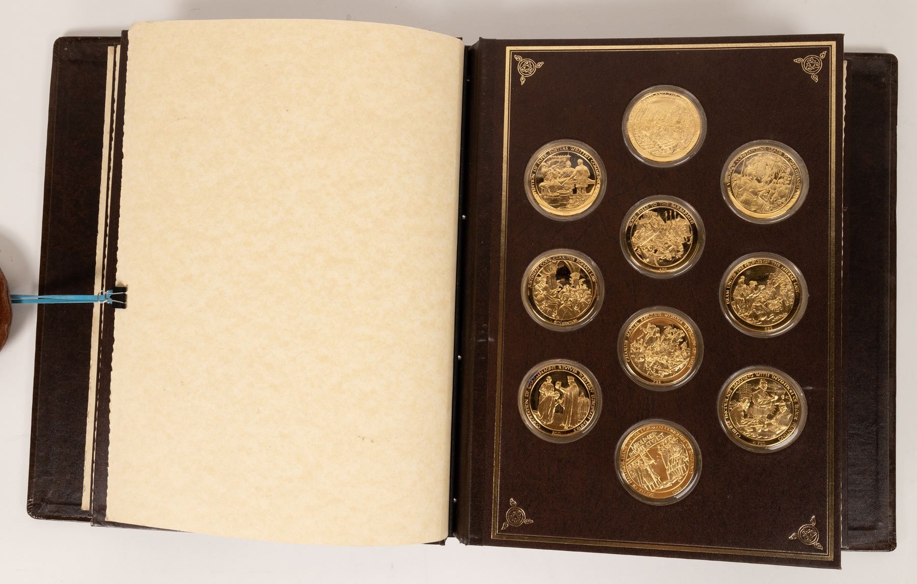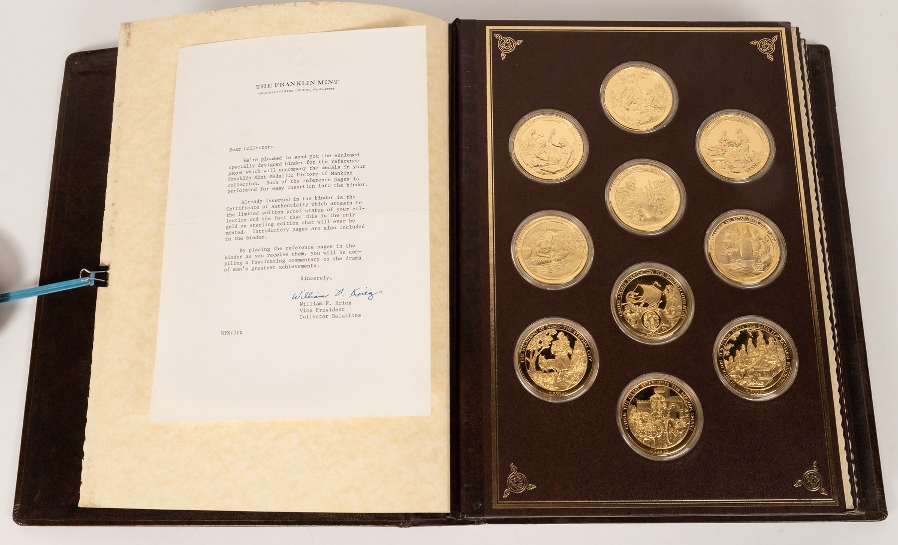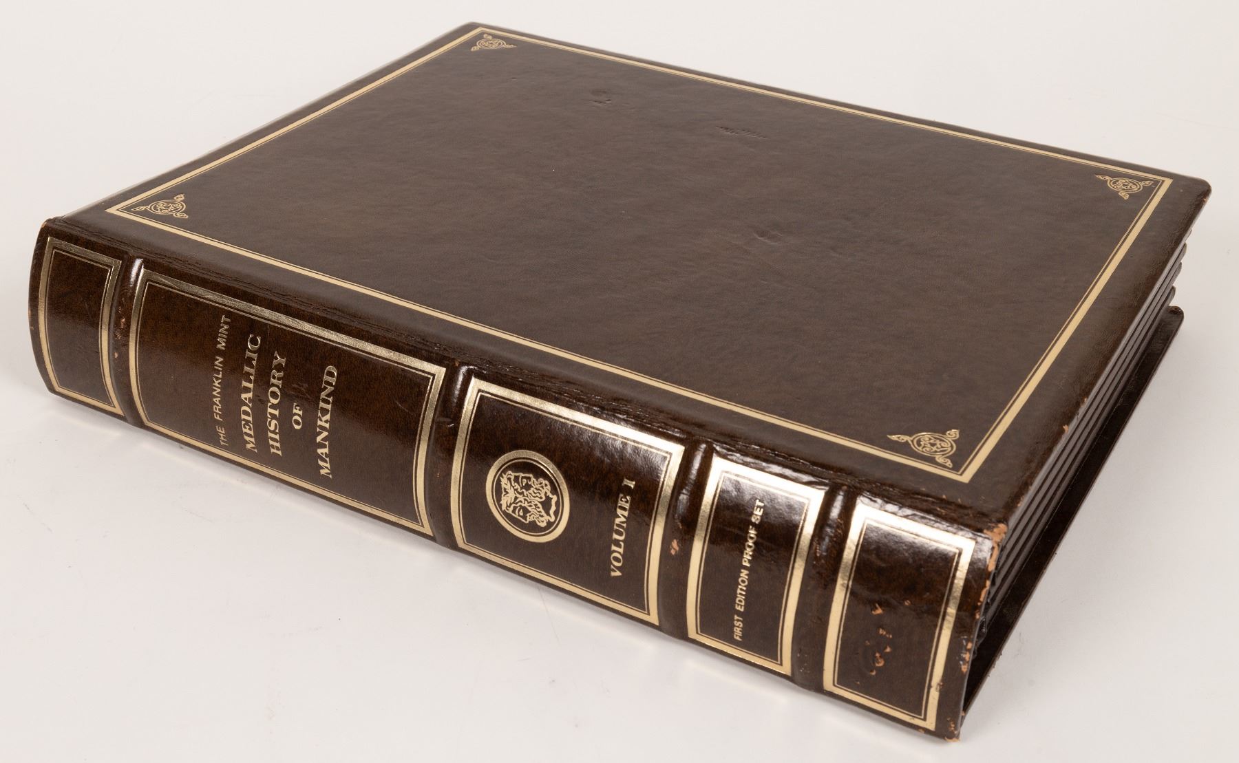 One of Franklin Mint's premier set, rarely seen. Brown leather album (11 1/2 x 14 1/2 x 4 inches): The Franklin Mint Medallic History of Mankind, Volume One with 50 fine art medals commemorating the most important events in the history of civilization. Hallmarked first edition proof set 24 KT gold on sterling silver. Each medal is 51 mm, 1000 grains of silver. Mintage was 3213, with the two volume set being issued over four years. This is the first volume. Two medals have some toning. 114 ounces of silver. A beautiful set.