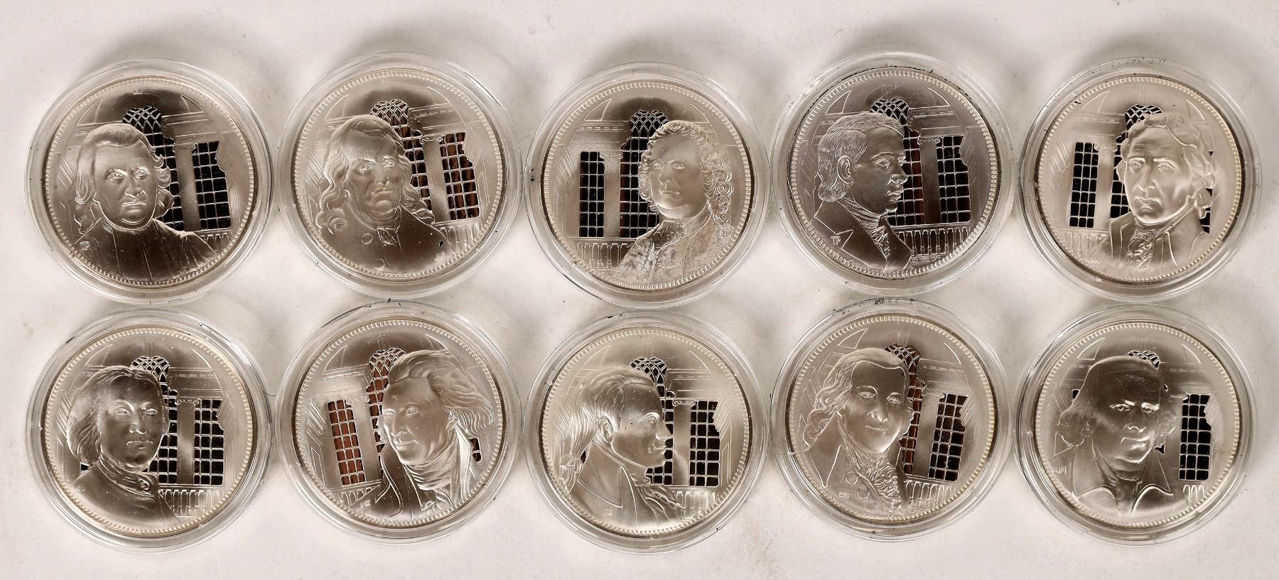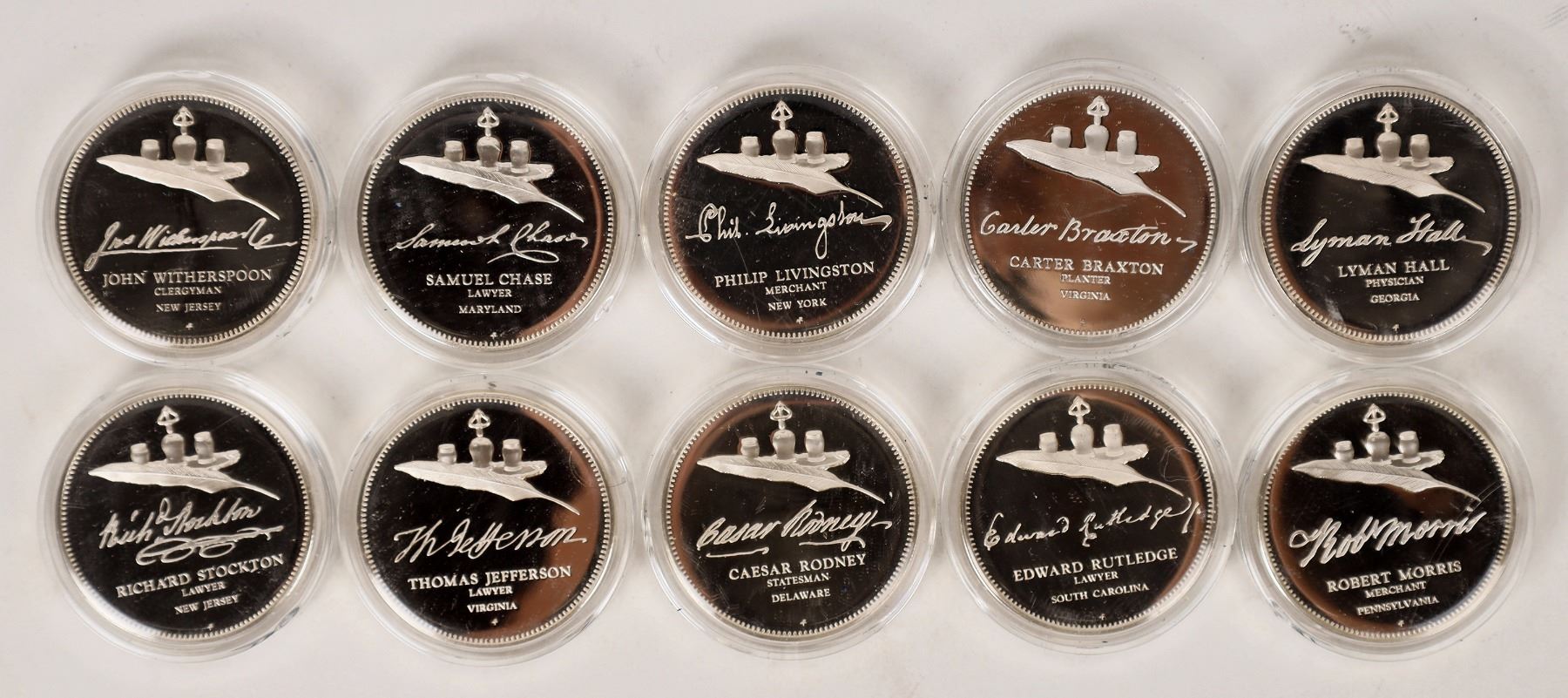 Lot of ten Franklin Mint silver proof medals commemorating signers of the Declaration of Independence. Medals are 39mm; 500 grains, .925 silver. Over 10 ounces of silver! Samuel, Chase; Carter Braxton; Edward Rutledge; Thomas Jefferson; Caesar Rodney; Lyman Hall; Robert Morris; John Witherspoon; Philip Livingston; Richard Stockton. Each in a hard plastic case.