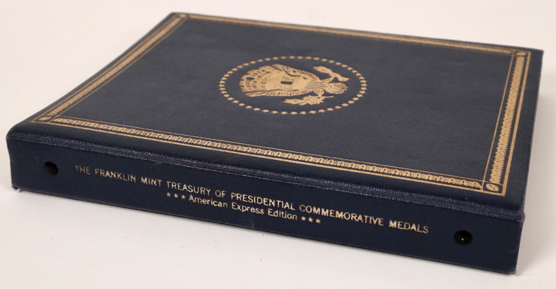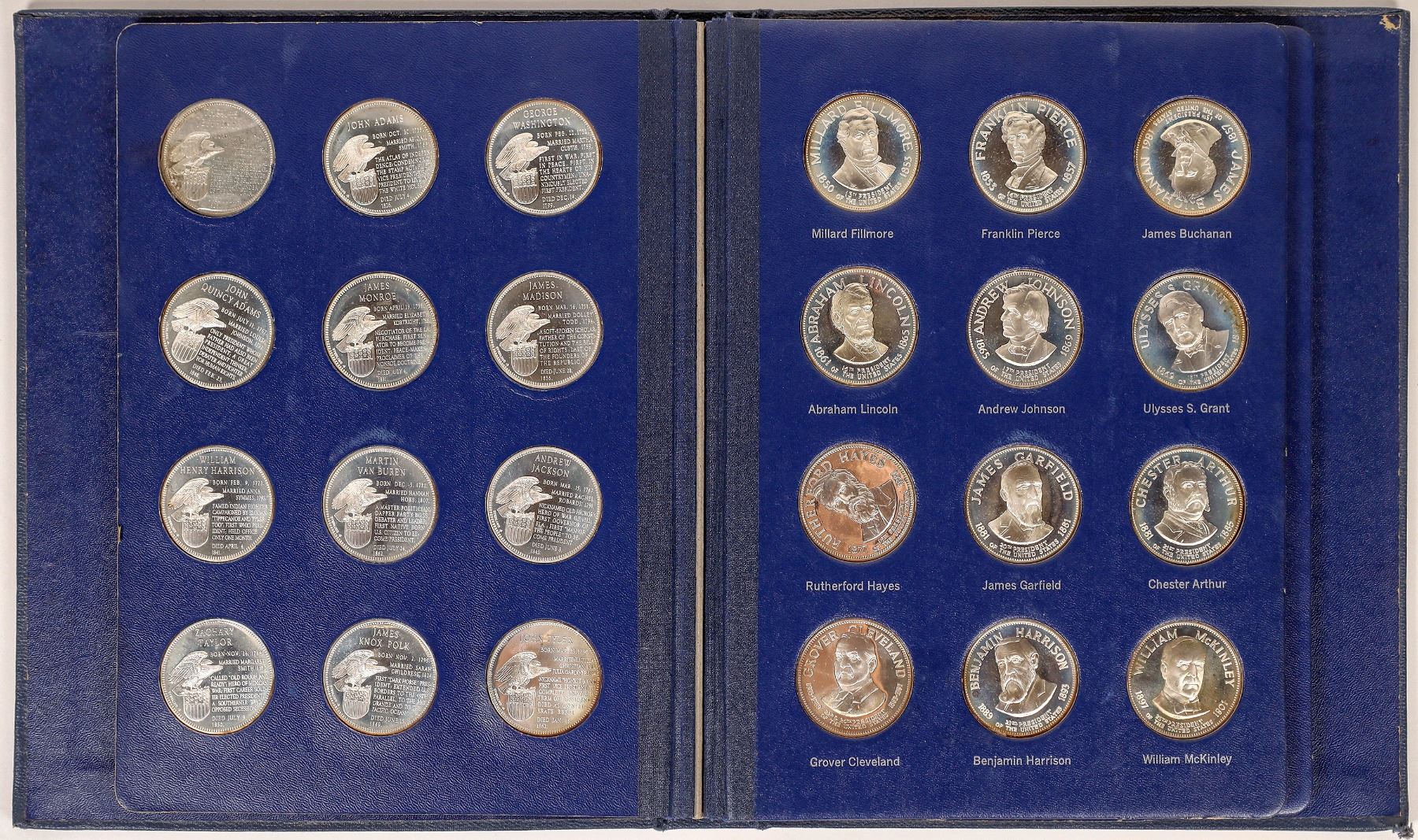 Blue binder with gold trim, holding 36 medals celebrating America's presidents from Washington through Nixon. Mintage was 63234 sets. Medals are 39mm; 500 grains; total set 37.5 oz. silver. The album is 9 x 11 x 2 inches. The plastic over Thomas Jefferson has been removed.