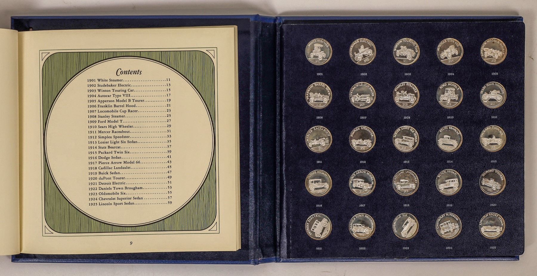 One of the earlier Franklin Mint sets.(1968). The complete set of 75 medals was issued in 3 albums of 25 medals each: Series 1, 2 & 3, these albums are most often seen separately. The Franklin Mint Collection of Antique Car Coins Series 1, first edition proof set sterling silver, containing 25 sterling silver medals and a 71 page brochure with descriptions of the cars by Floyd Clymer. Blue album is 9 1/2 x 9 1/2 inches in original box. The mintage was 5627. Each medal is 26mm; 0.23 oz .925 silver. The Apperson Model B Tourer has two carbon spots.