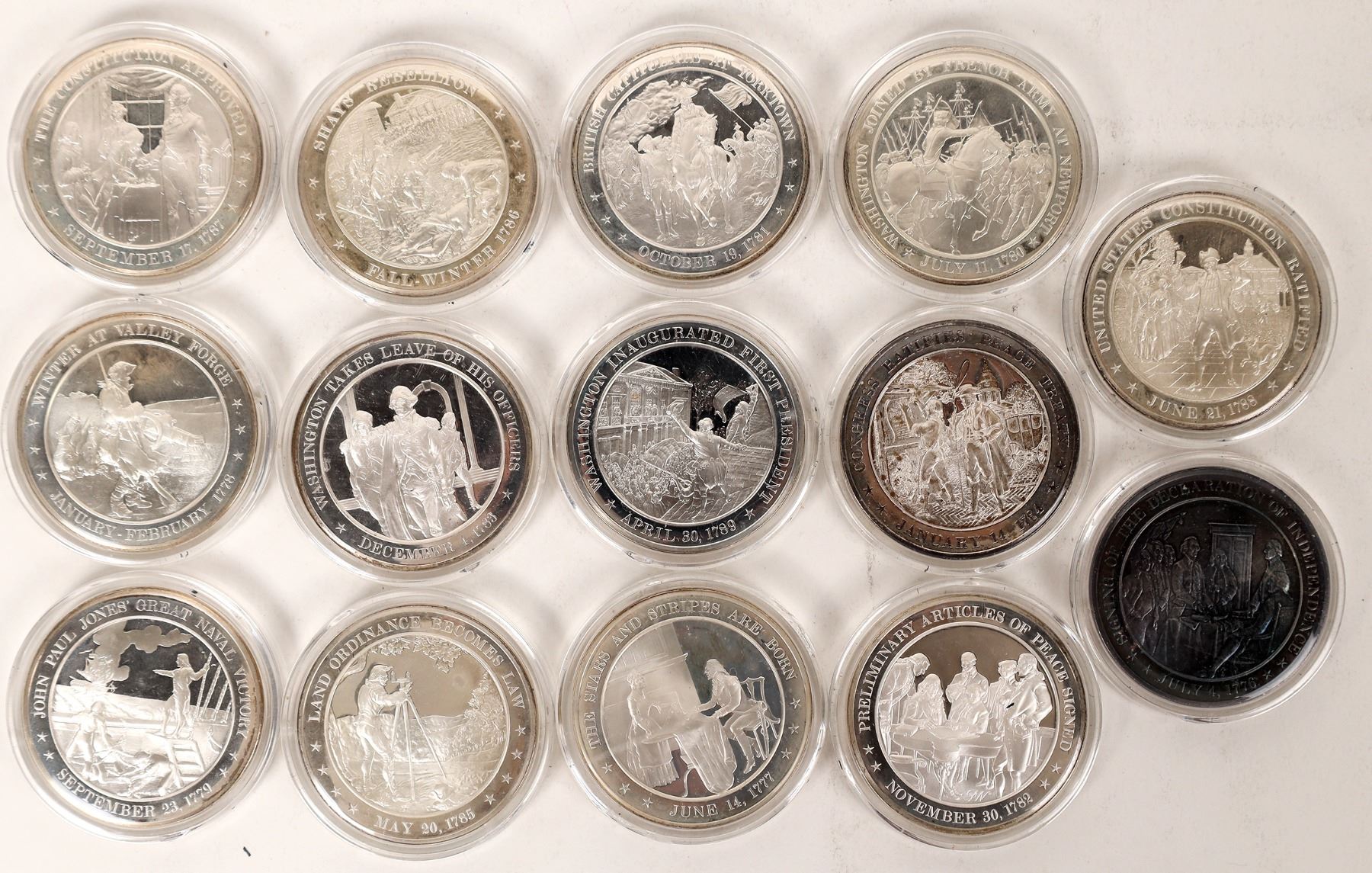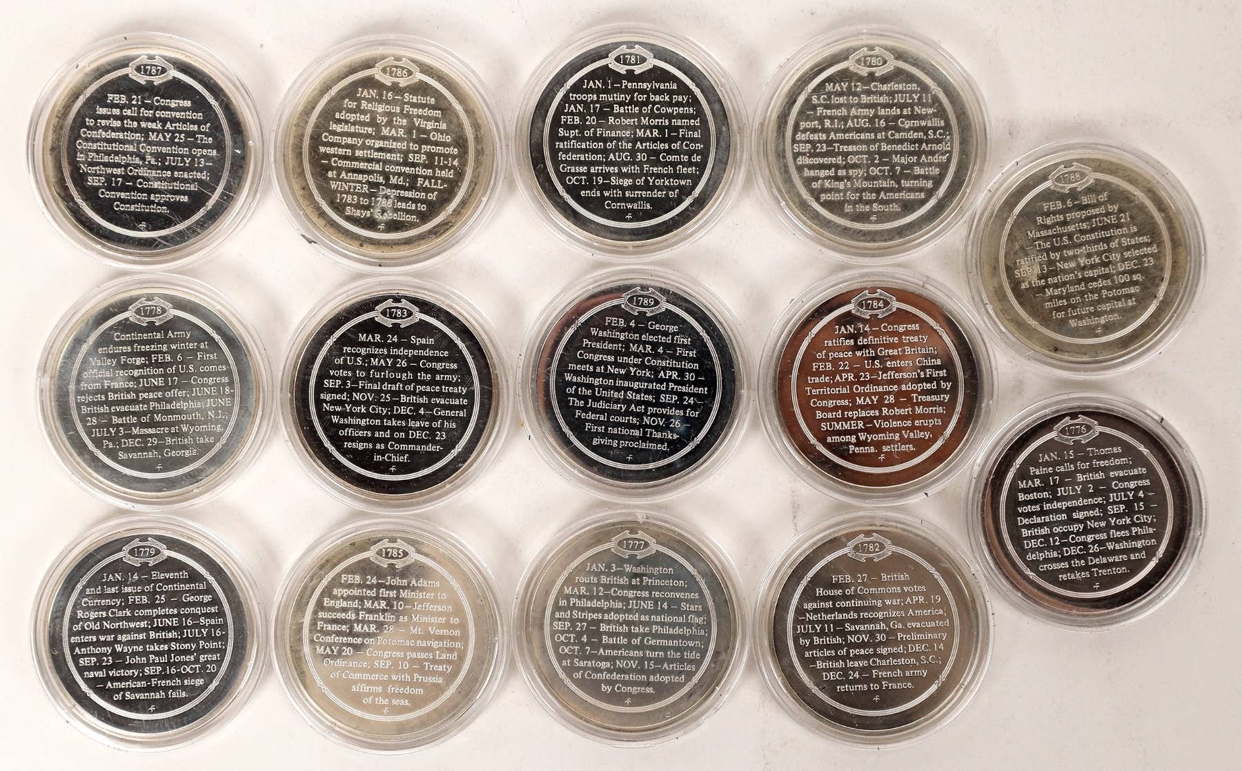 Franklin Mint History of the US silver proof medals. These are from a Sterling Silver set celebrating 200 years of US history each medal featuring a notable scene from the year on the obverse and a description of events on the reverse. This lot is 1776-1789, 14 medals. 45 mm, 600 grains sterling silver.