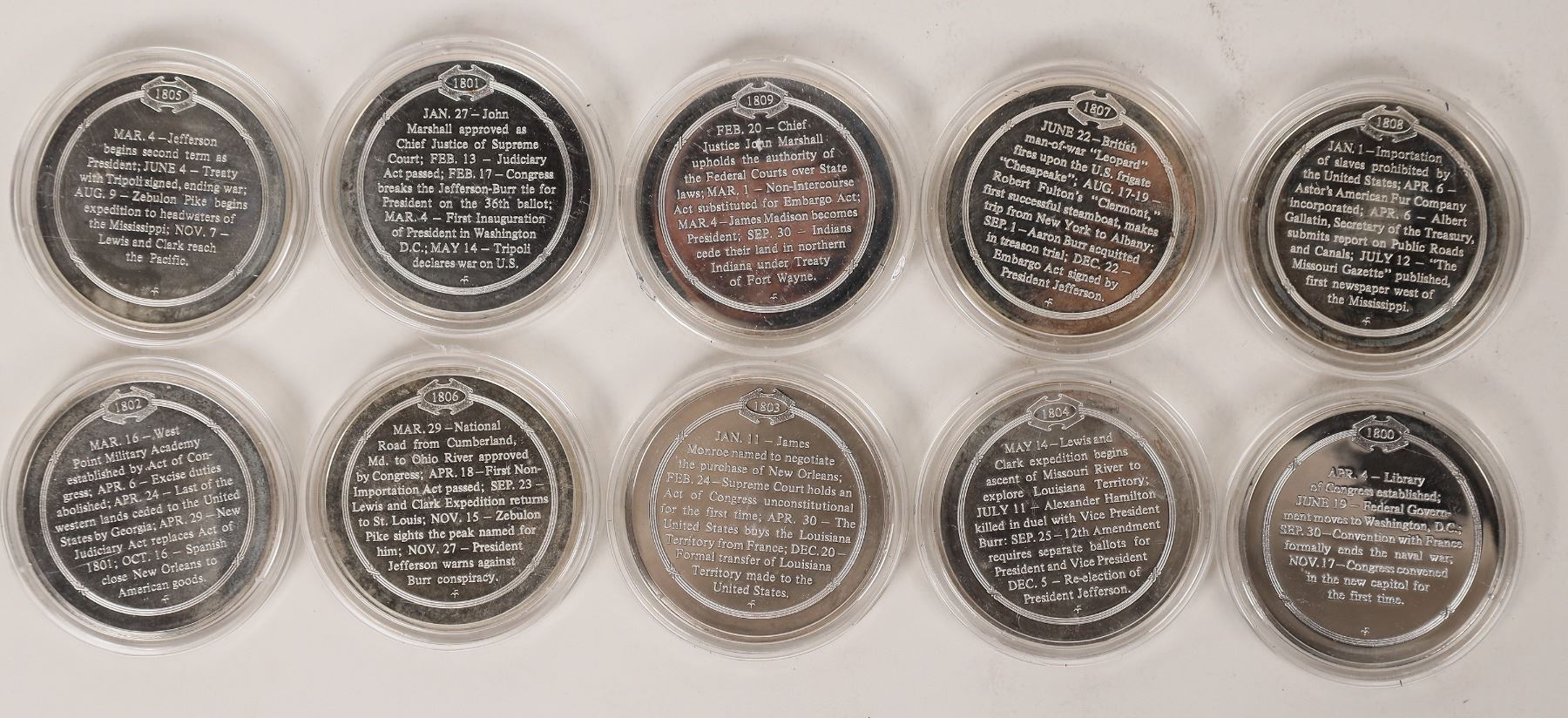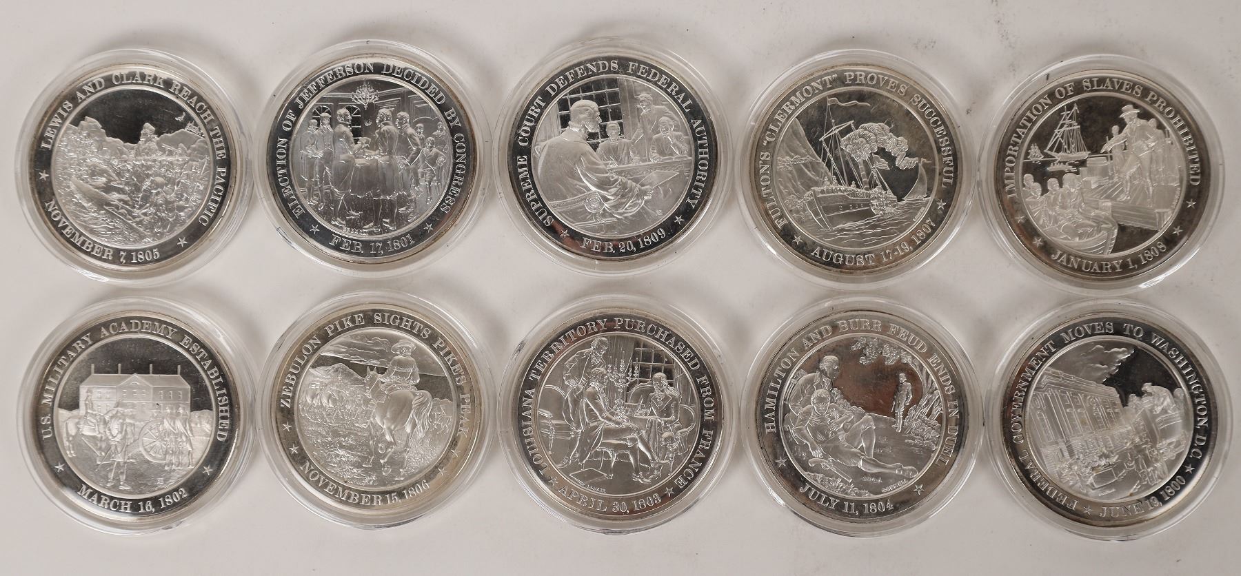 Franklin Mint History of the US silver proof medals. These are from a Sterling Silver set celebrating 200 years of US history each medal featuring a notable scene from the year on the obverse and a description of events on the reverse. This lot is 1800s, 10 medals. 45 mm, 600 grains sterling silver.