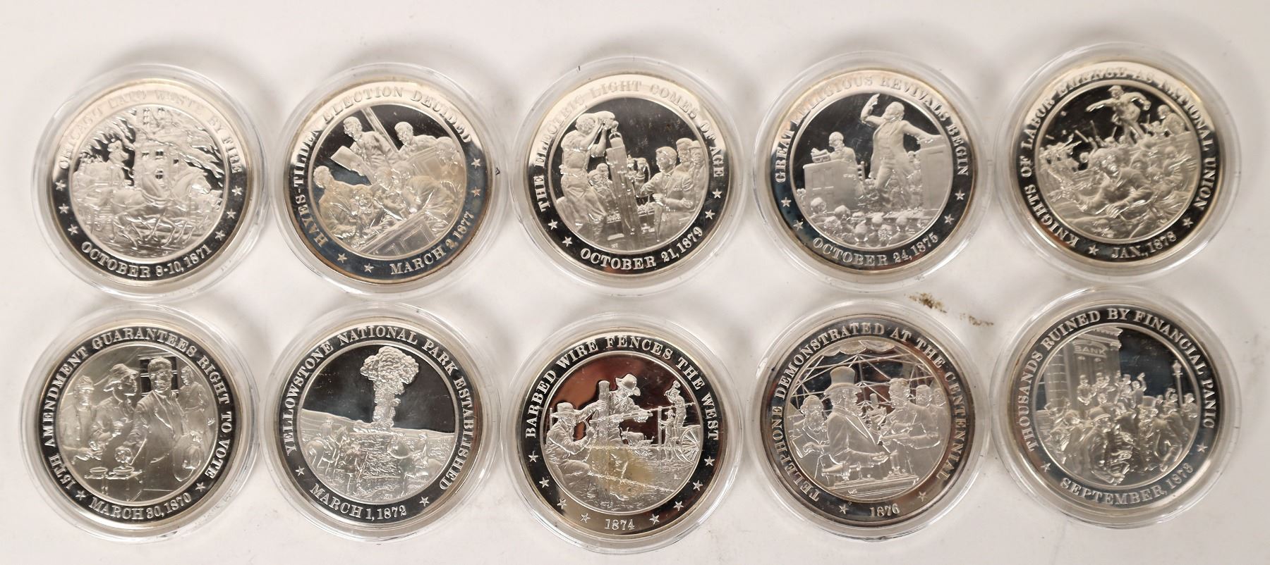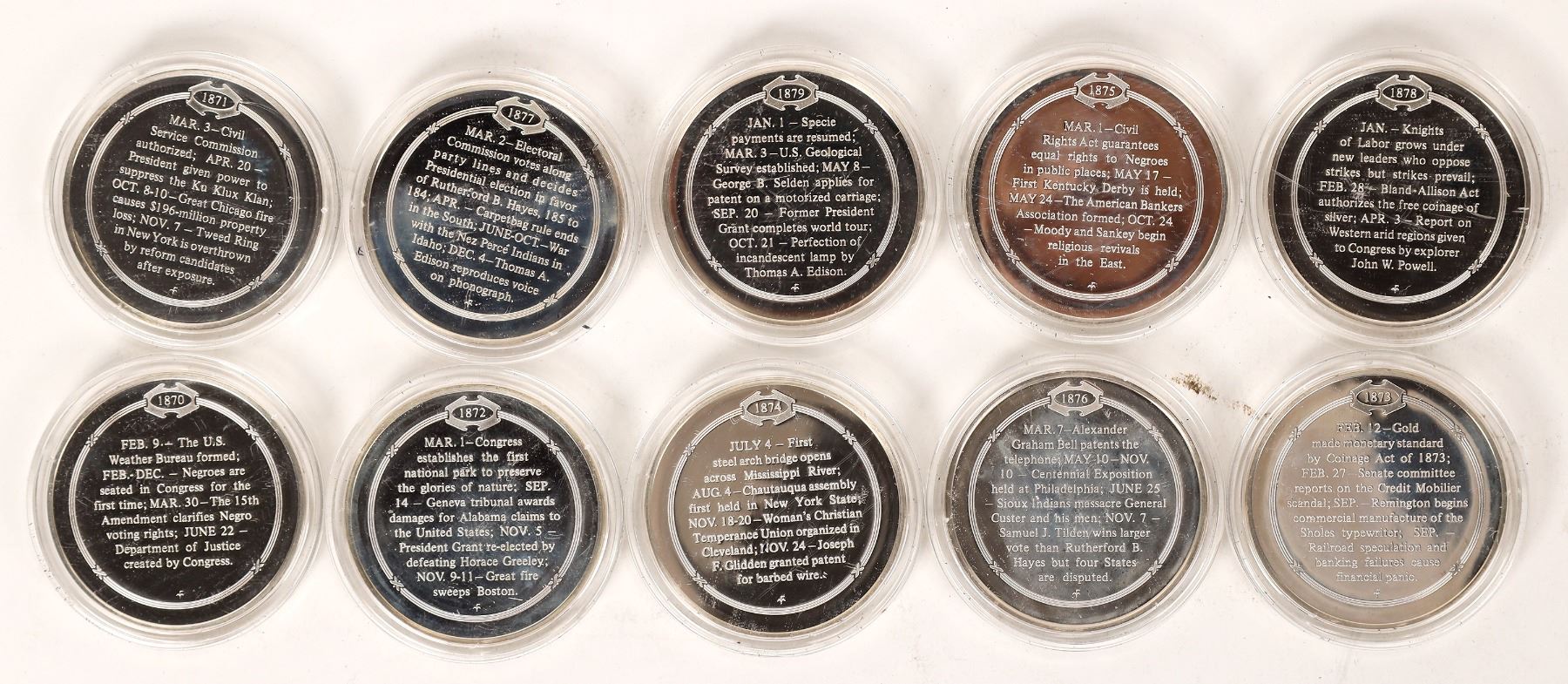 Franklin Mint History of the US silver proof medals. These are from a Sterling Silver set celebrating 200 years of US history each medal featuring a notable scene from the year on the obverse and a description of events on the reverse. This lot is 1870s, 10 medals. 45 mm, 600 grains sterling silver.