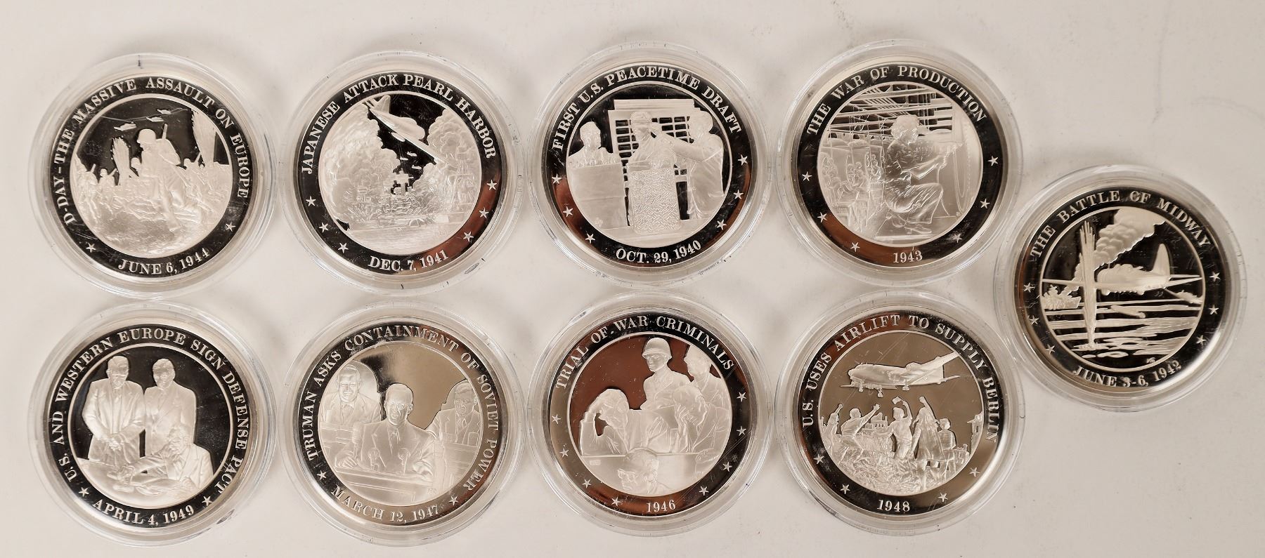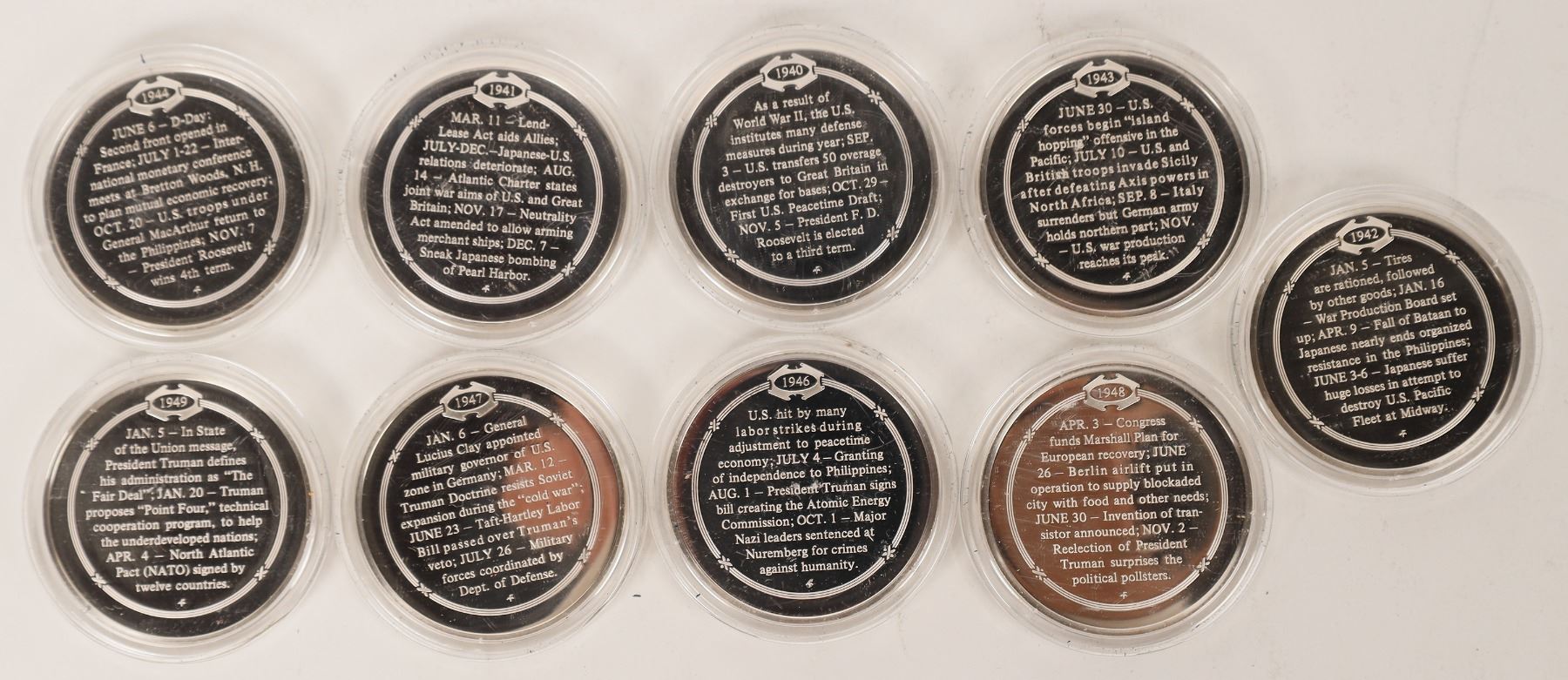 Franklin Mint History of the US silver proof medals. These are from a Sterling Silver set celebrating 200 years of US history each medal featuring a notable scene from the year on the obverse and a description of events on the reverse. This lot is 1940s, 9 medals (missing 1945). 45 mm, 600 grains sterling silver.