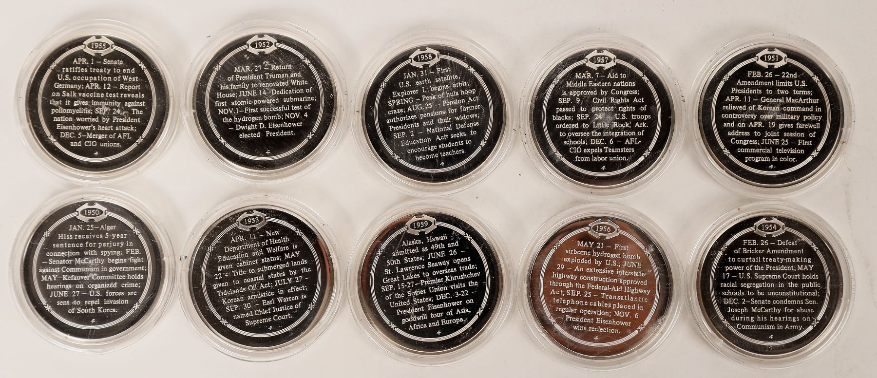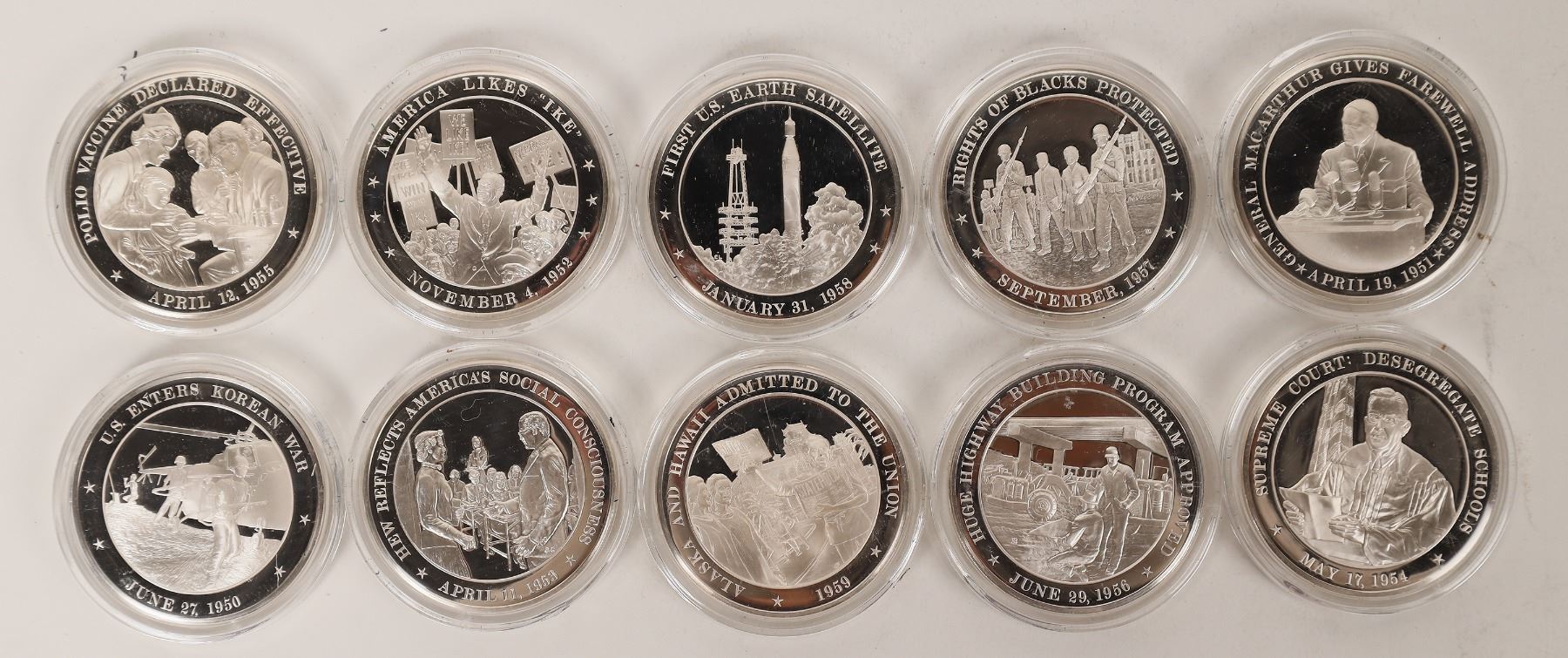 Franklin Mint History of the US silver proof medals. These are from a Sterling Silver set celebrating 200 years of US history each medal featuring a notable scene from the year on the obverse and a description of events on the reverse. This lot is 1950s, 10 medals. 45 mm, 600 grains sterling silver.