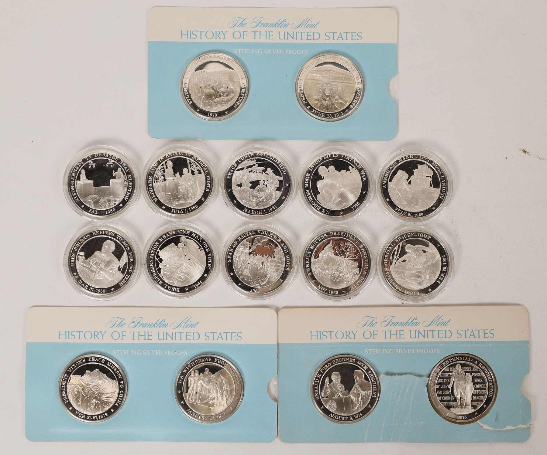 Franklin Mint History of the US silver proof medals. These are from a Sterling Silver set celebrating 200 years of US history each medal featuring a notable scene from the year on the obverse and a description of events on the reverse. This lot is 1960s (10) and 1970s (6), 16 medals total. 45 mm, 600 grains sterling silver.
