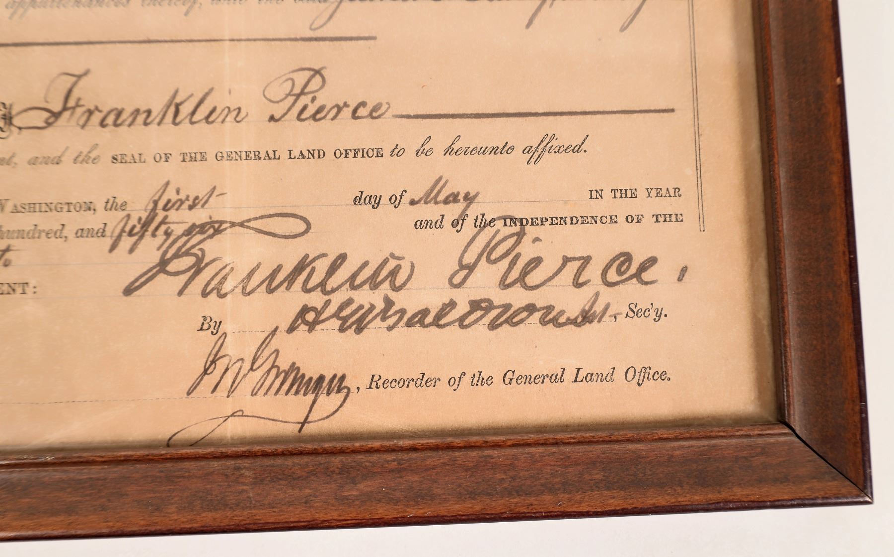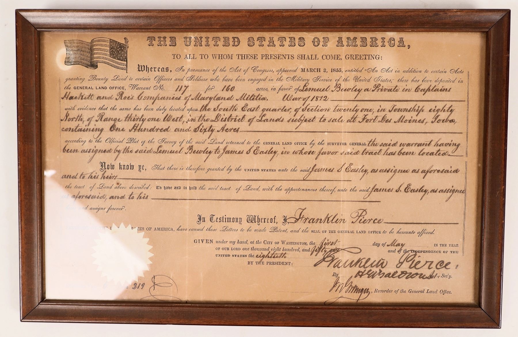 Grant of land in Iowa for service in the War of 1872 to Lemuel Bewley, a private in Captain Hackett's and Roe's Companies of Maryland Militia, dated May 1, 1856 and bearing a signature of Franklin Pierce, President of the United States from 1853-57. Pierce signature may not be original. Given to Mr. Hyatt by his cousin Randolf Thompson of Lock Have, PA. Frame 11x17". From the Hyatt Estate. Iowa 1856