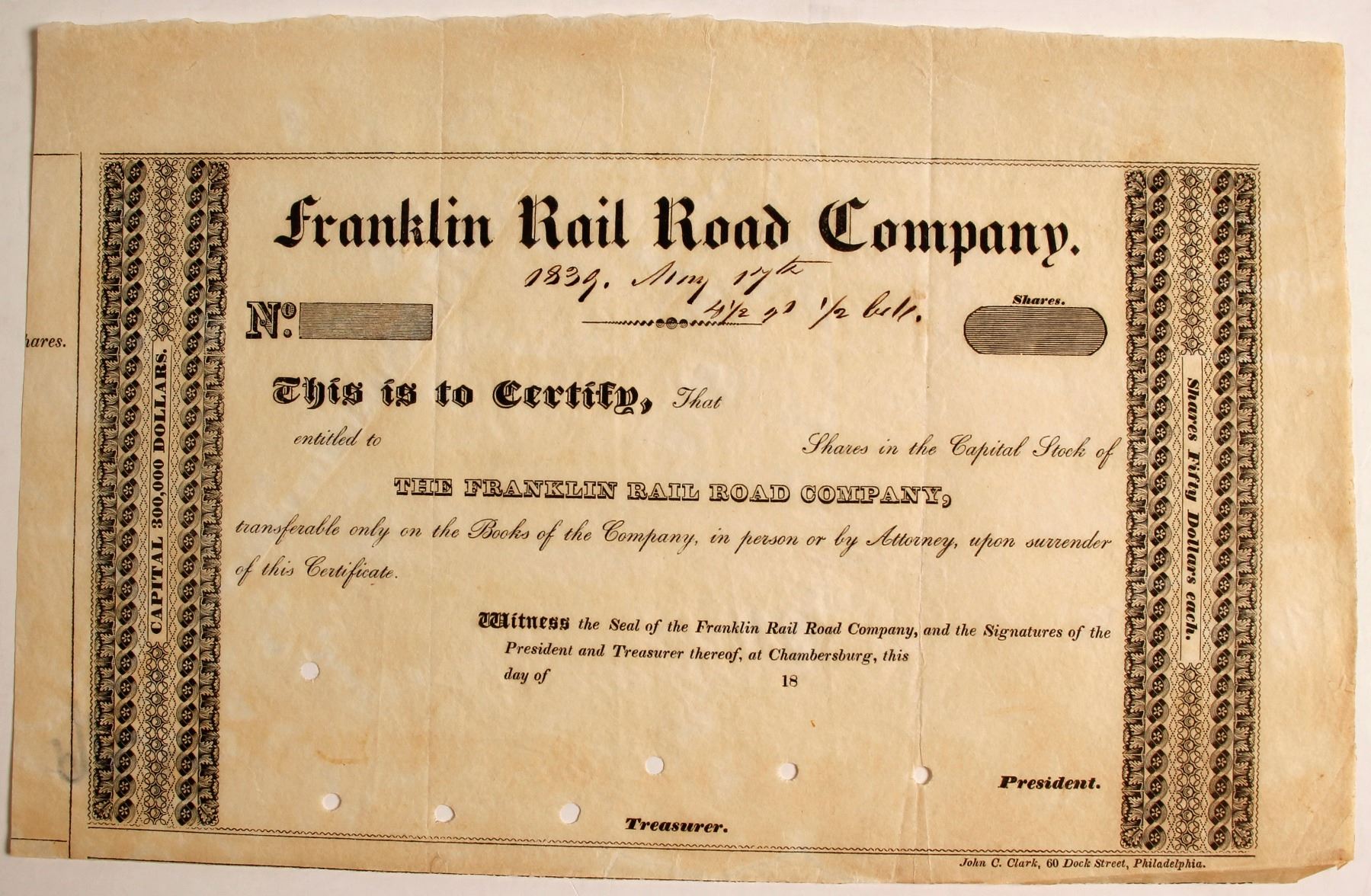 Non-issued Stock certificate for Franklin Rail Road Company dated May 17th, 1839. Praq Collection.