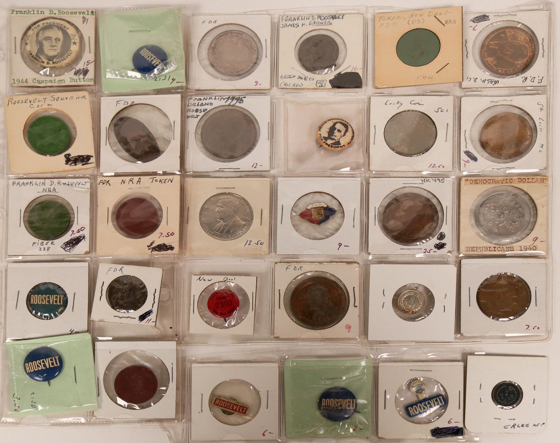 Several campaign pin backs and medallions aimed at the presidential campaigns of Franklin Delano Roosevelt, 32nd president of the United States. All are in good condition. See photos for more details.