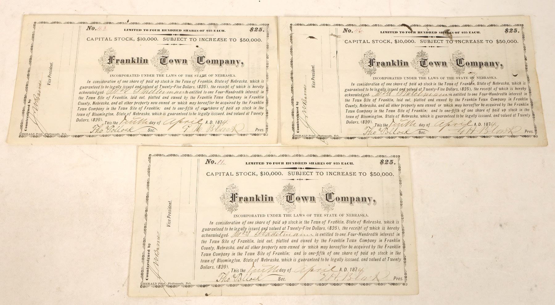 3 issued in 1874 for $25 or "one 400th interest in the Town Site of Franklin, laid out, platted and owned by the Franklin Town Company in Franklin County, Nebraska." Signed by president Blenk, vice president Barnes, and secretary Tollock. Not cancelled. Black border and print. Herald Print, Plattsmouth, Nebraska. 5.5 x10". The town was named after Benjamin Franklin.