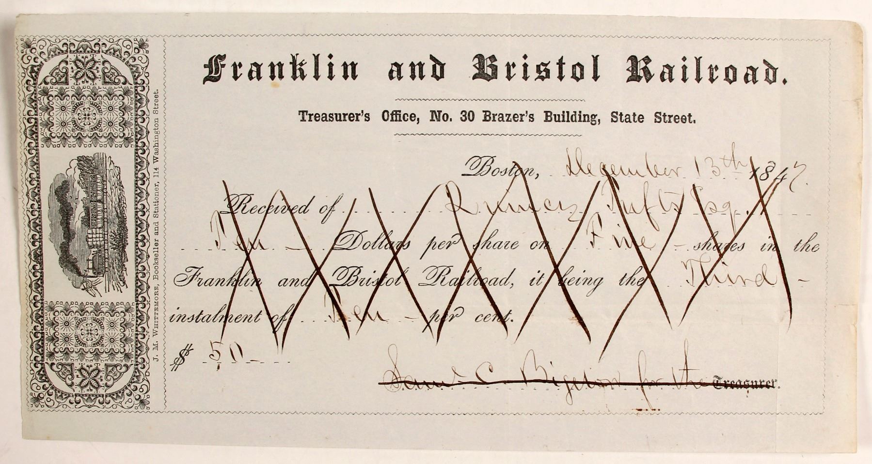 December 13, 1847, $10 per share on five shares of the Franklin and Bristol Railroad. 3rd Installment.The Franklin and Bristol Railroad started operations in 1848 and stopped service in 1849 for a total period of operations of 1 years. Franklin and Bristol Railroad only operated in 1 state which is indicative of smaller lines, or in some cases lines in larger states. Many one state railroads are short line railroads that didn't have large areas of coverage. Prag Collection. Unlisted in Cox.