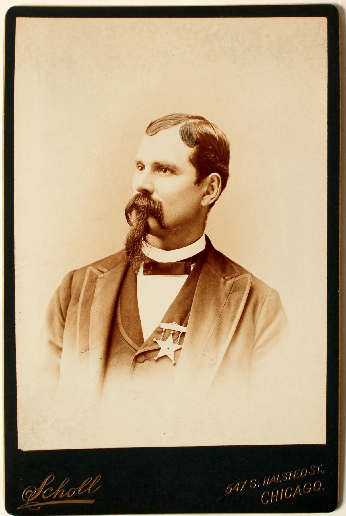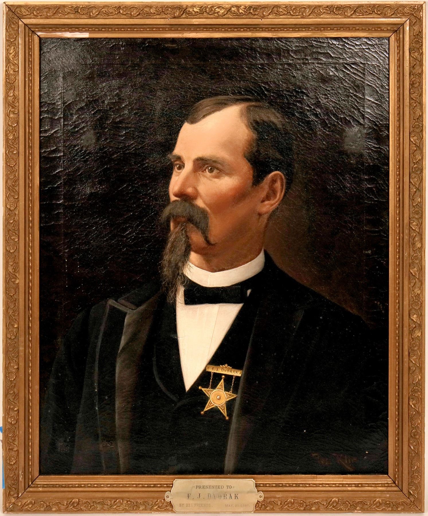 Original Oil on Canvas. A portrait of F. J. Dvorak. 26 X 31". Nickel plaque "Presented to F.J. Dvorak by his friends May 28, 1892" Includes an original cabinet card photograph of Dvorak by Scholl, photographer, Chicago. Signed by artist, Jos. Klir in red at lower right. We believe this artist, Jos. Klir is the Czechoslovakian artist born between 1860-1867 famous for painting, "The Lost Bet", a view of a post-election parade with banner of Grover Cleveland, Adlai E. Stevenson, and Gov. John Peter Altgeld. The signatures appear to match, though not much information is available on Josef Klir.